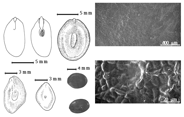 Seed: 5.3–10 mm long; 3.8–6.5 mm wide; 1–2 mm thick; not overgrown; not angular; symmetrical; oblong to ovate; compressed to flattened; with surface smooth; without visible radicle and cotyledon lobes; without hilar sinus; without umbo on seed faces; without medial ridge on each face. Cuticle not exfoliating; not inflated; not wrinkled. Testa present; without pieces of adhering epicarp; not adhering to endocarp; free from endocarp; glossy; not modified by a bloom; colored; monochrome; brown; glabrous; not smooth; with recessed features; concaved; osseous to coriaceous. Pleurogram present; 75 %. Pseudopleurogram absent. Fracture lines absent. Rim absent. Wing(s) absent. Raphe not visible. Hilum present; visible, or fully concealed; concealed by funicular remnant; without faboid split; punctiform; subapical to radicle tip to apical at apex of radicle tip; flush; not within corona, halo, or rim. Lens discernible; 0.1 mm long; with margins straight; linear; not in groove of raphe; mounded (within hilar depression); dissimilar color from testa; white; not within corona, halo, or rim. Endosperm present, or absent; thin; not pluglike and not resembling tip of radicle; adnate to testa. Cotyledons smooth; both outer faces flat; both the same thickness; both more or less of equal length; not folded; margin entire 180 degrees from base of radicle; similar at apex; partially concealing radicle; with lobes; with lobes overlapping; with basal groin formed by lobes; with the interface division terminating at base of radicle; without margins recessed; inner face flat; glabrous on inner face. Embryonic axis straight; parallel to length of seed; without a joint evident between the radicle and the cotyledons. Radicle differentiated from cotyledon; straight with embryonic axis; centered between cotyledons. Plumule well developed; glabrous.