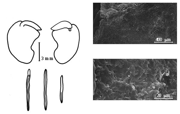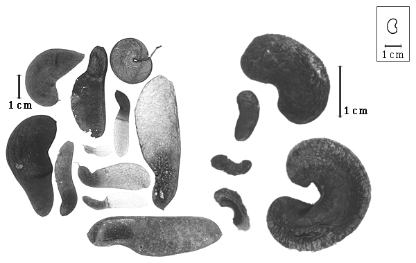 Seed: ;30 mm long; 3–15 mm wide; 1–7 mm thick; not overgrown, or overgrown, 1 seed filling entire fruit cavity (especially in M. lunatum); angular, or not angular; asymmetrical; reniform, or C-shaped, or circular, or ovate, or linear; flattened; with surface wrinkled, or smooth, or ridged (radiating from hilum area); without visible radicle and cotyledon lobes; with deep hilar sinus, or without hilar sinus; without umbo on seed faces; without medial ridge on each face. Cuticle not exfoliating; not inflated; not wrinkled. Testa present; without pieces of adhering epicarp; not adhering to endocarp; free from endocarp; dull; not modified by a bloom; colored; monochrome, or mottled; brown (dark reddish); with black overlay (areas where vitriolic tissue is located); glabrous; not smooth, or smooth; with elevated features; wrinkled; coriaceous. Pleurogram absent. Pseudopleurogram absent. Fracture lines absent. Rim absent. Wing(s) absent. Raphe visible, or not visible; from hilum to near base of seed and terminating (or midway to base); not bifurcating; darker than testa; black; raised. Hilum present; fully concealed (remaining with fruit in M. lunatum), or partially concealed; concealed by funicular remnant, or wing; without faboid split; punctiform, or larger than punctiform; 0.1–25 mm long; with curved outline, or angular outline; circular; irregular; between cotyledon and radicle lobe; recessed; not within corona, halo, or rim, or within halo; halo darker than testa (black). Lens not discernible. Endosperm absent. Cotyledons not smooth, or smooth; both outer faces convex; both the same thickness; both more or less of equal length; not folded; margin entire 180 degrees from base of radicle; similar at apex; partially concealing radicle, or not concealing radicle; split over radicle; with lobes; with lobes touching (auriculate), or overlapping, or not touching; without basal groin formed by lobes, or with basal groin formed by lobes; with the interface division terminating at base of radicle; without margins recessed; brown (to dark brown), or tan, or green (bright); inner face flat; glabrous on inner face. Embryonic axis deflexed; oblique to length of seed; without a joint evident between the radicle and the cotyledons. Radicle differentiated from cotyledon; linear; lobe tip straight, or curved, or hooked; deflexed and parallel to cotyledon width; centered between cotyledons; less than 1/2 length of cotyledons. Plumule well developed, or moderately developed; glabrous.