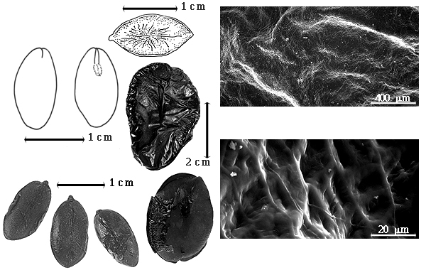 ); 1–8 mm thick; not overgrown; not angular; symmetrical; oblong to elliptic, or circular (sub); compressed; with surface smooth; without visible radicle and cotyledon lobes; without hilar sinus; without umbo on seed faces; without medial ridge on each face. Cuticle not exfoliating; not inflated; not wrinkled. Testa present; without pieces of adhering epicarp; not adhering to endocarp; free from endocarp; dull; not modified by a bloom; colored; monochrome; brown; glabrous; not smooth; with elevated features; rugose and shagreen, or wrinkled (especially over seed); chartaceous (breaking and falling off the seeds). Pleurogram absent. Pseudopleurogram absent. Fracture lines absent. Rim absent. Wing(s) present, or absent; continuous around seed (minute winglike rim about 0.4 mm wide). Raphe not visible. Hilum present; visible; without faboid split; larger than punctiform; 0.3–0.4 mm long; with straight outline; oblong, or linear; subapical to radicle tip to apical at apex of radicle tip; raised; not within corona, halo, or rim. Lens not discernible. Endosperm absent. Cotyledons smooth; both outer faces flat, or both outer faces convex; both the same thickness; both more or less of equal length; not folded; margin entire 180 degrees from base of radicle; similar at apex; completely concealing radicle; split over radicle; with lobes, or without lobes; with lobes overlapping; with basal groin formed by lobes; with the interface division terminating at base of radicle; without margins recessed; dark brown; inner face flat; glabrous on inner face. Embryonic axis straight; parallel to length of seed; without a joint evident between the radicle and the cotyledons. Radicle differentiated from cotyledon; triangular; lobe tip straight; straight with embryonic axis; centered between cotyledons; less than 1/2 length of cotyledons. Plumule well developed; densely pubescent.