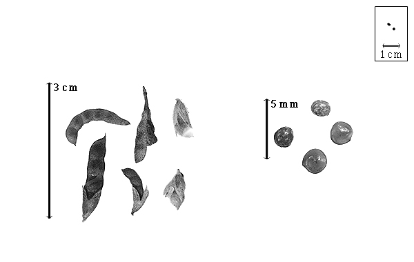 Fruit: A legume; unilocular; 0.8–2 cm long; 0.3–0.5 cm wide; 0.08–0.2 cm thick; 2–9 times longer than wide; with deciduous androecial sheath; with deciduous corolla; with deciduous calyx; without orifice formed by curving of fruit or fruit segments; straight, or curved; not plicate; not twisted; asymmetrical, or symmetrical; linear, or ovate to oblong (narrowly); with both sutures nearly straight; not inflated; compressed; without beak; short tapered at apex; aligned with longitudinal axis of fruit; short tapered at base; aligned with longitudinal axis of fruit; with the apex and base uniform in texture; coriaceous; seed chambers externally visible; seed chambers with the raised seed chambers torulose; margin constricted; margin slightly constricted along both margins; margin without sulcus; margin plain; wing(s) absent; substipitate; with all layers dehiscing; splitting along suture(s). Dehiscence of valves along both sutures; apical and down; active; with valves slightly twisting. Replum invisible. Epicarp dull; monochrome, or multicolored; mottled; brown, or tan; with reddish brown overlay; mottling color combination constant; with mottling over seed chambers; with surface texture uniform; pubescent and indurate; with hairs erect; with 1 type of pubescence; tomentose; with pubescence golden, or gray; with simple hairs; pliable; with hair bases plain; eglandular; without spines; not smooth; with elevated features; not veined; not tuberculate; warty; not exfoliating; without cracks; without embedded tissue, much thicker than epicarp, running from base to apex. Mesocarp present; thin; surface not veined; 1-layered; without balsamic vesicles; without fibers; without reniform canals; solid; coriaceous. Endocarp present; visible; dull; opaque; monochrome; brown (reddish); smooth; without adhering pieces of testa; subseptate; with septa thin (tissue paper-like), flexible; with septa eglandular; chartaceous; not exfoliating; remaining fused to mesocarp and epicarp; without wings; entire. Seed(s) 1–8; length parallel with fruit length; neither overlapping nor touching; in 1 series. Funiculus of 1 length only; flattened; straight. Aril present, or absent (so tiny that it can be missed); dry; when dry tiny tongue-aril; entire; white.