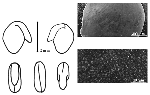 Seed: 2–2.5 mm long; 2–2.5 mm wide; 1.5 mm thick; not overgrown; not angular; asymmetrical; ovate to circular (sub); compressed; without visible radicle and cotyledon lobes; without umbo on seed faces; without medial ridge on each face. Cuticle not exfoliating; not inflated; not wrinkled. Testa present; without pieces of adhering epicarp; not adhering to endocarp; free from endocarp; dull; not modified by a bloom; colored; monochrome, or mottled; with frequent mottles; reddish to dark reddish brown; glabrous; smooth; coriaceous. Pleurogram absent. Pseudopleurogram absent. Fracture lines absent. Rim absent. Wing(s) absent. Raphe not visible. Hilum present; partially concealed; concealed by aril; with faboid split; with the lips of the faboid split the same color as the rest of the hilum; punctiform; between cotyledon and radicle lobe; recessed; within rim; rim color of testa, or lighter than testa, or darker than testa. Lens discernible; with margins straight, or curved; irregular; irregular, or key-hole shaped; not in groove of raphe; adjacent to hilum; 0.1–0.2 mm from hilum; mounded; dissimilar color from testa; darker than testa; black (at least center); not within corona, halo, or rim. Endosperm present; thin; not pluglike and not resembling tip of radicle; covering entire embryo; adnate to embryo. Cotyledons smooth; both outer faces convex; both the same thickness; both more or less of equal length; not folded; margin entire 180 degrees from base of radicle; similar at apex; not concealing radicle; entire over radicle; without lobes; with the interface division terminating at base of radicle; without margins recessed; yellow, or green; inner face flat; glabrous on inner face. Embryonic axis deflexed; oblique to length of seed; without a joint evident between the radicle and the cotyledons. Radicle differentiated from cotyledon; linear; deflexed and parallel to cotyledon length; centered between cotyledons; 1/2 to nearly length of cotyledons. Plumule rudimentary; glabrous.