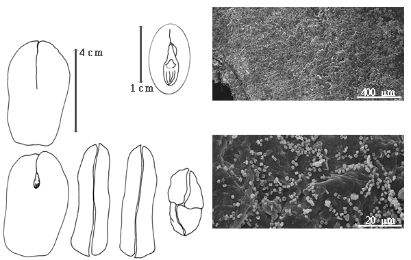 Seed: 55 mm long; 35 mm wide; 15 mm thick; not overgrown; not angular; symmetrical; oblong; compressed; with surface smooth; without visible radicle and cotyledon lobes; without hilar sinus; without umbo on seed faces; without medial ridge on each face. Testa absent. Endosperm absent. Cotyledons not smooth; 4–6 grooves on each face; both outer faces convex; both the same thickness; both more or less of equal length; not folded; margin entire 180 degrees from base of radicle; similar at apex; completely concealing radicle; split over radicle; without lobes; with the interface division terminating at base of radicle; without margins recessed; tan; inner face flat; glabrous on inner face. Embryonic axis straight; parallel to length of seed; without a joint evident between the radicle and the cotyledons. Radicle differentiated from cotyledon; linear; lobe tip straight; straight with embryonic axis; centered between cotyledons; less than 1/2 length of cotyledons. Plumule well developed; glabrous.