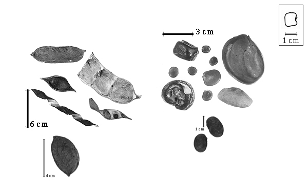 Seed: 8–50 mm long; 6–35 mm wide; 1–25 mm thick; overgrown, 1 seed filling entire fruit cavity, or not overgrown; not angular; symmetrical, or asymmetrical; oblong to ovate, or reniform, or irregular, or rhombic (irregularly); terete, or compressed, or flattened; with surface smooth, or wrinkled; with visible radicle and cotyledon lobes, or without visible radicle and cotyledon lobes; without external groove between radicle and cotyledon lobes; with shallow hilar sinus, or without hilar sinus; without umbo on seed faces; without medial ridge on each face. Cuticle not exfoliating; not inflated; not wrinkled. Testa present; without pieces of adhering epicarp; not adhering to endocarp; free from endocarp; dull to glossy; not modified by a bloom; colored; monochrome; brown to black, or yellow; glabrous; smooth, or not smooth; with elevated features; wrinkled; chartaceous. Pleurogram absent. Pseudopleurogram absent. Fracture lines absent, or present; transverse. Rim absent. Wing(s) absent. Raphe not visible, or visible; from hilum through lens to base of seed and terminating; not bifurcating; color of testa, or lighter than testa; brown; slightly raised, or recessed (slightly). Hilum present; visible, or fully concealed, or partially concealed; concealed by radicle lobe, or funicular remnant; with faboid split; with the lips of the faboid split the same color as the rest of the hilum; larger than punctiform; 1–4 mm long; with curved outline; circular, or elliptic; subapical to radicle tip, or apical according to radicle tip but marginal according to seed length; raised, or flush, or recessed; within rim, or not within corona, halo, or rim; rim color darker than testa. Lens discernible; 1–2 mm long; with margins straight, or curved; linear to triangular, or oblong; circular; not in groove of raphe; confluent with hilum; flush, or recessed; same color as testa, or similar color as testa; darker than testa; brown to black; not within corona, halo, or rim, or within rim; rim color of testa. Endosperm present, or absent; thin, or trace; not pluglike and not resembling tip of radicle; covering entire embryo, or covering at least 1/2 of embryo, but not entire embryo, or restricted to region of embryo; adnate to testa. Cotyledons smooth, or not smooth; wrinkled; both outer faces convex; both the same thickness; both more or less of equal length; not folded, or with both folded; not sufficiently folded for inner face to touch itself; portions of inner folded face unequal; margin entire 180 degrees from base of radicle; similar at apex; partially concealing radicle; split over radicle, or notched at radicle; without lobes, or with lobes; with lobes touching (auriculate); with basal groin formed by lobes; with the interface division terminating at base of radicle; without margins recessed; brown, or orange, or white, or yellow, or tan; inner face flat, or concave; glabrous on inner face. Embryonic axis oblique, or right angled; oblique to length of seed; without a joint evident between the radicle and the cotyledons. Radicle differentiated from cotyledon; bulbose, or linear; lobe tip straight; oblique to cotyledons; centered between cotyledons; less than 1/2 length of cotyledons, or 1/2 to nearly length of cotyledons. Plumule rudimentary to moderately developed; glabrous.