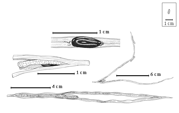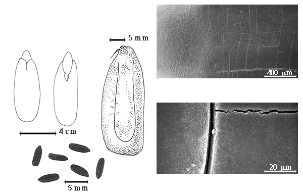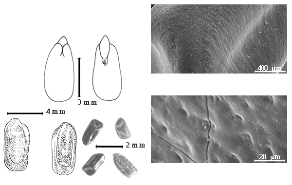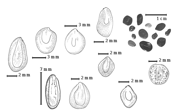Seed: 2.3–9 mm long; 1.5–8 mm wide; 1–3 mm thick; not overgrown; not angular; symmetrical; ovate to circular, or elliptic to irregular, or oblong, or rhombic (with or without 1 face of apex and base concaved caused by overlapping seeds); flattened to compressed, or terete (rarely); with surface grooved (2 (rarely 1) longitudinal grooves on each face); longitudinal; without visible radicle and cotyledon lobes; without hilar sinus; without umbo on seed faces; without medial ridge on each face. Cuticle not exfoliating; not inflated; not wrinkled. Testa present; without pieces of adhering epicarp; not adhering to endocarp; free from endocarp; glossy to dull; not modified by a bloom; colored; monochrome, or mottled (rarely); brown (various shades of brown or in combination with other colors to areola lighter colored); with various shades of brown overlay to black overlay (occasionally); glabrous; smooth, or not smooth; with recessed features, or elevated features; blistered cuticle; faintly striate, or concaved (usually 1 face of apex and base); osseous. Pleurogram present (arms not always of equal length and areola width variable); 50–95 %. Pseudopleurogram absent. Fracture lines present, or absent. Rim absent. Wing(s) absent. Raphe not visible. Hilum present; visible, or fully concealed; concealed by funicular remnant; without faboid split; punctiform; subapical to radicle tip; flush; not within corona, halo, or rim. Lens discernible; 0.2–0.5 mm long; with margins curved; elliptic to ovate; not in groove of raphe; mounded to flush, or recessed; same color as testa, or similar color as testa (occasionally surrounded by dark halo); lighter than testa to darker than testa; tan; not within corona, halo, or rim, or within halo (occasionally); halo color darker than testa. Endosperm present; thick to thin; not pluglike and not resembling tip of radicle; adnate to testa. Cotyledons smooth; both outer faces flat; both the same thickness; both more or less of equal length; not folded; margin entire 180 degrees from base of radicle; similar at apex; partially concealing radicle; split over radicle; with lobes; with lobes overlapping, or touching (auriculate); with basal groin formed by lobes (when lobes overlap), or without basal groin formed by lobes (when lobes only touch); with the interface division terminating at base of radicle; without margins recessed; inner face flat; glabrous on inner face. Embryonic axis straight; parallel to length of seed; without a joint evident between the radicle and the cotyledons. Radicle differentiated from cotyledon; straight with embryonic axis; centered between cotyledons. Plumule well developed to moderately developed; glabrous.