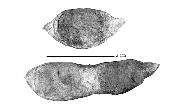 Fruit: A legume; unilocular; 2–4.5 cm long; 0.8–1.3 cm wide; 0.1–0.2 cm thick; 2–9 times longer than wide; with deciduous androecial sheath; with deciduous corolla; with persistent calyx; with calyx shorter than fruit; without orifice formed by curving of fruit or fruit segments; straight; not plicate; not twisted; symmetrical; elliptic, or oblong, or obovate, or ovate; not inflated; compressed; with beak (very short, 1 mm or less long); straight; with solid beak the same color and texture as fruit; rounded at apex, or tapered at apex; aligned with longitudinal axis of fruit; long tapered at base; aligned with longitudinal axis of fruit; with the apex and base uniform in texture; chartaceous; seed chambers externally invisible; margin constricted (when 2-seeded), or not constricted (when 1-seeded); margin constricted along both margins to slightly constricted along both margins; margin without sulcus; margin plain; wing(s) absent; stipitate; with the stipe 2–5 mm long; apparently indehiscent. Replum invisible. Epicarp dull; monochrome; brown to tan; with surface texture uniform; pubescent and indurate; with hairs appressed; with 1 type of pubescence; sparsely, antrorse strigose; with pubescence brown; with pubescence uniformly distributed; with simple hairs; pliable; with hair bases plain; eglandular; without spines; not smooth; with elevated features; veined; reticulately veined; not tuberculate; wrinkled; not exfoliating; without cracks; without embedded tissue, much thicker than epicarp, running from base to apex. Mesocarp absent. Endocarp present; visible; dull; opaque; monochrome; brown to tan; smooth; without adhering pieces of testa; nonseptate; chartaceous; not exfoliating; remaining fused to epicarp; without wings; entire. Seed(s) 1, or 2; in 1 series.