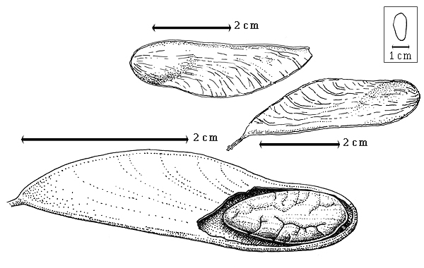 Fruit: A legume; unilocular; 4–7 cm long; 1.2–2 cm wide; 0.3–0.4 cm thick; 2–9 times longer than wide; with deciduous androecial sheath; with deciduous corolla; with deciduous calyx; without orifice formed by curving of fruit or fruit segments; straight; not plicate; not twisted; asymmetrical; with 1 straight and 1 curved suture; widest at base, or widest near middle or D-shaped; not inflated; flattened; without beak; tapered at apex; oblique with longitudinal axis of fruit; tapered at base; oblique with longitudinal axis of fruit; with the apex and base uniform in texture; coriaceous; seed chambers externally visible; margin constricted; margin slightly constricted only on 1 margin; margin without sulcus; margin embellished; margin with wing(s); wing(s) present; wing(s) 40 mm wide; wing(s) samaroid; wing(s) basal (wing basal, seed apical); stipitate; with the stipe 6–7 mm long; indehiscent. Replum invisible. Epicarp dull; monochrome; reddish brown; with surface texture uniform; glabrous; eglandular; without spines; not smooth; with elevated features; veined; longitudinally veined relative to fruit length; not tuberculate; not exfoliating; without cracks; without embedded tissue, much thicker than epicarp, running from base to apex. Mesocarp present; surface not veined; 1-layered; without balsamic vesicles; without fibers; without reniform canals; reticulately fibrous throughout; coriaceous. Endocarp present; visible; dull; opaque; monochrome; tan; without adhering pieces of testa; nonseptate; exfoliating (longitudinally tearing into several parrtially united stripes); remaining fused to mesocarp and epicarp; entire. Seed(s) 1; length parallel with fruit length. Funiculus 0.1–1 mm long; of 1 length only; flattened; hooked ("right angle curve near apex"). Aril absent.