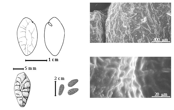 Seed: 13–19 mm long; 6–8 mm wide; 3–4 mm thick; not overgrown; not angular; symmetrical; oblong; compressed; with surface smooth; without visible radicle and cotyledon lobes; without hilar sinus; without umbo on seed faces; without medial ridge on each face. Cuticle not exfoliating; not inflated; not wrinkled. Testa present; without pieces of adhering epicarp; not adhering to endocarp; free from endocarp; dull; not modified by a bloom; colored; mottled (especially along the margin); black and brown (mottles black); with black overlay; glabrous; not smooth; with recessed features; longitudinally striate (deeply intruded into cotyledons); chartaceous. Pleurogram absent. Pseudopleurogram absent. Fracture lines absent. Rim absent. Wing(s) absent. Raphe not visible. Hilum present; visible; without faboid split; punctiform (within dark red halo); subapical to radicle tip; flush; not within corona, halo, or rim. Lens not discernible. Endosperm absent. Cotyledons not smooth; ruminate (and faces locking together); both outer faces convex; both the same thickness; both more or less of equal length; not folded; margin entire 180 degrees from base of radicle; similar at apex; not concealing radicle; notched at radicle; with the interface division terminating at base of radicle; without margins recessed; inner face flat; glabrous on inner face. Embryonic axis straight; oblique to length of seed; without a joint evident between the radicle and the cotyledons. Radicle differentiated from cotyledon; centered between cotyledons. Plumule rudimentary; glabrous.