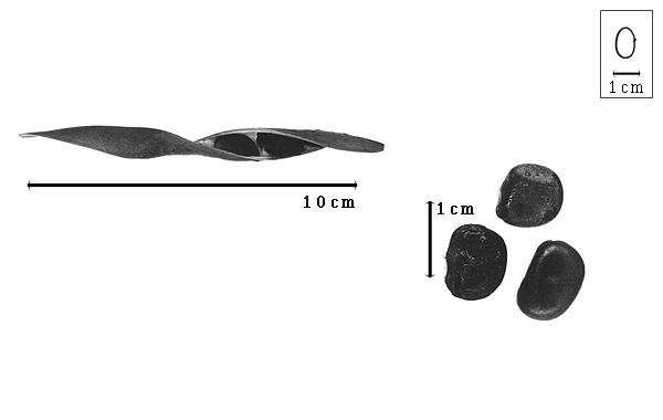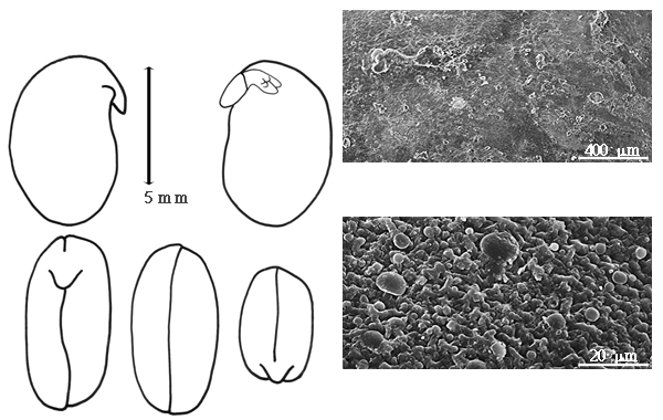 Seed: 8–14.5 mm long; 7–11 mm wide; 4.3–7.5 mm thick; not overgrown; not angular, or angular (slightly); symmetrical, or asymmetrical; irregular to oblong to ovate; compressed; with surface smooth; without visible radicle and cotyledon lobes; without hilar sinus; without umbo on seed faces; without medial ridge on each face. Cuticle not exfoliating; not inflated; not wrinkled. Testa present; without pieces of adhering epicarp; not adhering to endocarp, or partially adhering to endocarp; free from endocarp; dull; not modified by a bloom; colored; monochrome; brown; glabrous; not smooth; with recessed features, or recessed features and elevated features; wrinkled; pitted with small separate pits; coriaceous. Pleurogram absent. Pseudopleurogram absent. Fracture lines absent. Rim absent. Wing(s) absent. Raphe not visible. Hilum present; partially concealed; concealed by funicular remnant; with faboid split; with the lips of the faboid split the same color as the rest of the hilum; larger than punctiform; 2.7–4.3 mm long; with curved outline; elliptic to oval; apical according to radicle tip but marginal according to seed length; recessed; within rim; rim color of testa, or darker than testa. Lens discernible; 1.7–2.8 mm long; with margins curved; ovate; not in groove of raphe; confluent with hilum; mounded; similar color as testa; darker than testa; black to brown; within rim; rim color of testa, or darker than testa. Endosperm absent. Cotyledons smooth, or not smooth; wrinkled; both outer faces convex; both the same thickness, or one thicker than the other (rarely); both more or less of equal length, or 1 longer than other (rarely); not folded; margin entire 180 degrees from base of radicle; similar at apex; completely concealing radicle; notched at radicle; with lobes, or without lobes; with lobes not touching; with basal groin formed by lobes; with the interface division terminating at base of radicle; without margins recessed, or with margin(s) recessed; with both margins recessed; yellowish white, or tan; inner face flat; glabrous on inner face. Embryonic axis oblique, or right angled; parallel to length of seed, or oblique to length of seed; without a joint evident between the radicle and the cotyledons. Radicle differentiated from cotyledon; bulbose; lobe tip straight; deflexed and parallel to cotyledon width, or oblique to cotyledons; centered between cotyledons; less than 1/2 length of cotyledons. Plumule moderately developed, or well developed; glabrous.