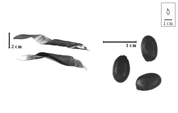 Seed: 7–12 mm long; 4.5–7 mm wide; 3.8–6.5 mm thick; not overgrown; angular, or not angular; symmetrical; elliptic; terete to quadrangular; with surface smooth; without visible radicle and cotyledon lobes; without hilar sinus; without umbo on seed faces; without medial ridge on each face. Cuticle not exfoliating; not inflated; not wrinkled. Testa present; without pieces of adhering epicarp; not adhering to endocarp; free from endocarp; dull; not modified by a bloom; colored; monochrome, or mottled; with frequent mottles; reddish brown; with brown overlay (dark); glabrous; smooth; chartaceous. Pleurogram absent. Pseudopleurogram absent. Fracture lines absent. Rim absent. Wing(s) absent. Raphe visible; from hilum to near base of seed and terminating; not bifurcating; color of testa; raised. Hilum present; partially concealed; concealed by aril; without faboid split; larger than punctiform; 1.4–2 mm long; with curved outline; elliptic; apical at apex of radicle tip; raised; within rim; rim color darker than testa. Lens not discernible. Endosperm absent. Cotyledons smooth; both outer faces convex; both the same thickness; both more or less of equal length; not folded; margin entire 180 degrees from base of radicle; similar at apex; partially concealing radicle; notched at radicle; without lobes; with the interface division terminating at base of radicle; without margins recessed; tan; inner face flat; glabrous on inner face. Embryonic axis straight; oblique to length of seed; without a joint evident between the radicle and the cotyledons. Radicle differentiated from cotyledon; triangular; lobe tip straight; oblique to cotyledons; centered between cotyledons; less than 1/2 length of cotyledons. Plumule rudimentary; glabrous.
