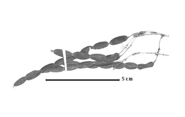 Fruit: A loment (or a loment segment); 10–15 cm long; 0.7–0.85 cm wide; 0.1–0.4 cm thick (assumed); more than 9 times longer than wide; with persistent androecial sheath; with deciduous corolla; with persistent calyx, or deciduous calyx; with calyx shorter than fruit; without orifice formed by curving of fruit or fruit segments; straight, or curved (slightly); not plicate; not twisted; asymmetrical, or symmetrical; moniliform; with both sutures parallelly curved; not inflated; flattened; without beak, or with beak; straight; with solid beak the same color and texture as fruit; rounded at apex; aligned with longitudinal axis of fruit; rounded at base; oblique with longitudinal axis of fruit; with the apex and base uniform in texture; membranous, or chartaceous (both assumed); seed chambers externally visible; margin constricted; margin constricted along both margins; margin without sulcus; margin plain; wing(s) absent; stipitate; with the stipe 10–15 mm long; indehiscent. Replum invisible. Loment an intact article; indehiscent; segments (articles) inconspicuous; segments (articles) 15–20 mm long; segments (articles) widest across seed area; segments (articles) with all essentially similar in shape; segments (articles) oblong. Epicarp dull; monochrome; greenish brown, or green; with surface texture uniform; pubescent and indurate; with hairs appressed; with 1 type of pubescence; with pubescence reddish brown; with simple hairs; pliable; with hair bases plain; eglandular; without spines; not smooth; with elevated features; veined; longitudinally veined relative to fruit length (assumed); not tuberculate; not exfoliating; without cracks. Mesocarp present, or absent (assumed to be like Desmodium 11.09)). Seed(s) 8–9; length parallel with fruit length; neither overlapping nor touching; in 1 series. Funiculus of 1 length only.
