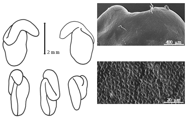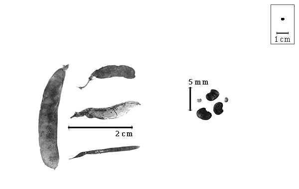Seed: 2.5–3.5 mm long; 2–2.8 mm wide; 1.2–1.3 mm thick; not overgrown; angular, or not angular; asymmetrical; mitaform; compressed; with visible radicle and cotyledon lobes; without external groove between radicle and cotyledon lobes; without hilar sinus; without umbo on seed faces; without medial ridge on each face. Cuticle not exfoliating; not inflated; not wrinkled. Testa present; without pieces of adhering epicarp; not adhering to endocarp; free from endocarp; dull; not modified by a bloom; colored; monochrome, or mottled and streaked; with frequent mottles; with frequent streaks; brownish red; with black overlay; glabrous; smooth; coriaceous. Pleurogram absent. Pseudopleurogram absent. Fracture lines absent. Rim absent. Wing(s) absent. Raphe visible; from hilum to lens; not bifurcating; darker than testa; raised. Hilum present; visible; with faboid split; with the lips of the faboid split the same color as the rest of the hilum; punctiform; marginal according to radicle tip; recessed; not within corona, halo, or rim. Lens discernible; with margins curved; punctiform; not in groove of raphe; adjacent to hilum; 1 mm from hilum; mounded; similar color as testa; darker than testa; brownish red; not within corona, halo, or rim. Endosperm present; thick; not pluglike and not resembling tip of radicle; covering entire embryo; adnate to testa. Cotyledons smooth; both outer faces convex; both the same thickness; both more or less of equal length; not folded; margin entire 180 degrees from base of radicle; similar at apex; not concealing radicle; entire over radicle; without lobes; with the interface division terminating at base of radicle; without margins recessed; tan; inner face flat; glabrous on inner face. Embryonic axis deflexed; oblique to length of seed; without a joint evident between the radicle and the cotyledons. Radicle differentiated from cotyledon; linear; lobe tip straight; with 360 degree turn; not centered between cotyledons (radicle outside 1 cotyledon and inside other, therefore junctions for each cotyledon different); exceeding length of cotyledons. Plumule rudimentary; glabrous.