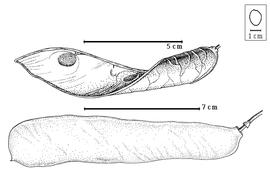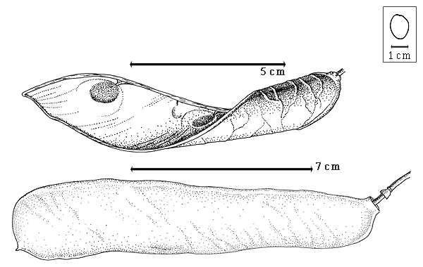 Fruit: A legume; unilocular; 10–16 cm long; 4–5 cm wide; 0.3 cm thick; 2–9 times longer than wide; with deciduous androecial sheath; with deciduous corolla; with deciduous calyx; without orifice formed by curving of fruit or fruit segments; straight; not plicate; not twisted; asymmetrical; oblong; not inflated; flattened; without beak; tapered at apex; oblique with longitudinal axis of fruit; rounded at base; oblique with longitudinal axis of fruit to right angled with longitudinal axis of fruit; with the apex and base uniform in texture; ligneous; seed chambers externally invisible; margin not constricted; margin without sulcus; margin plain; wing(s) absent; nearly stipitate to substipitate; with the stipe 6 mm long; with all layers dehiscing; splitting along suture(s). Dehiscence of valves along both sutures; apical and down; active; with valves separately enrolling. Replum invisible. Epicarp dull; monochrome; reddish brown; with surface texture uniform; minutely velvety reddish brown pubescent and indurate, or glabrate; with hairs erect; eglandular; without spines; not smooth; with elevated features; veined; transversely veined relative to fruit length; not tuberculate; not exfoliating; without cracks; without embedded tissue, much thicker than epicarp, running from base to apex. Mesocarp present; surface not veined; 2-layered; without balsamic vesicles; with fibers; without reniform canals; with fibers over solid layer; ligneous. Endocarp present; visible; dull; opaque; monochrome; reddish brown; without adhering pieces of testa; nonseptate; not exfoliating; remaining fused to mesocarp and epicarp; entire. Seed(s) at least 4; length oblique to fruit length; neither overlapping nor touching; in 1 series. Funiculus of 1 length only. Aril absent.