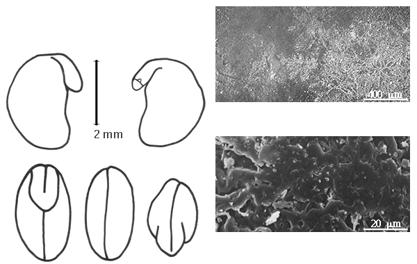 Seed: 2–7 mm long; 2–4 mm wide; 2.5 mm thick; not overgrown; not angular; asymmetrical; ovate, or reniform; compressed to terete (nearly); without visible radicle and cotyledon lobes; without hilar sinus; without umbo on seed faces; without medial ridge on each face. Cuticle not exfoliating; not inflated; not wrinkled. Testa present; without pieces of adhering epicarp; not adhering to endocarp; free from endocarp; dull; not modified by a bloom; colored; monochrome; black, or brown (reddish); glabrous; smooth; coriaceous. Pleurogram absent. Pseudopleurogram absent. Fracture lines absent. Rim absent. Raphe not visible. Hilum present; visible; with faboid split; with the lips of the faboid split the same color as the rest of the hilum; larger than punctiform; 0.6 mm long; with curved outline; circular; marginal according to radicle tip; flush; not within corona, halo, or rim. Lens not discernible. Endosperm present; thin; not pluglike and not resembling tip of radicle; covering entire embryo; adnate to testa. Cotyledons smooth; both outer faces convex; both the same thickness; both more or less of equal length; not folded; margin entire 180 degrees from base of radicle; similar at apex; not concealing radicle; entire over radicle, or split over radicle; without lobes, or with lobes; with the interface division terminating in radicle tissue; without margins recessed; tan; inner face flat; glabrous on inner face. Embryonic axis deflexed; parallel to length of seed; without a joint evident between the radicle and the cotyledons. Radicle differentiated from cotyledon; linear; deflexed and parallel to cotyledon length; centered between cotyledons; less than 1/2 length of cotyledons. Plumule rudimentary; glabrous.