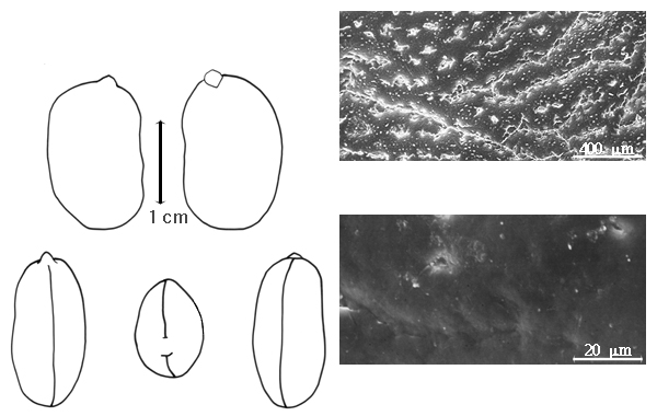 Seed: 6–40 mm long; 6–40 mm wide; 5–20 mm thick; not overgrown; not angular, or angular; symmetrical, or asymmetrical; circular, or elliptic, or irregular, or oblong, or ovate; terete, or compressed; with surface smooth; without visible radicle and cotyledon lobes; without hilar sinus; without umbo on seed faces; without medial ridge on each face. Cuticle not exfoliating; not inflated; not wrinkled. Testa present; without pieces of adhering epicarp; not adhering to endocarp; free from endocarp; dull, or glossy; not modified by a bloom; colored; bichrome, or monochrome, or mottled; with infrequent mottles; red, or black, or orange, or red and black, or orange and black; with black overlay; glabrous; smooth; coriaceous to chartaceous. Pleurogram absent. Pseudopleurogram absent. Fracture lines absent, or present; irregular. Rim absent. Wing(s) absent. Raphe visible, or not visible; from hilum to near base of seed and terminating; not bifurcating; color of testa; flush, or raised. Hilum present; visible, or partially concealed; concealed by aril, or funiculus; with faboid split; with the lips of the faboid split the same color as the rest of the hilum; larger than punctiform; 1–45 mm long; with curved outline, or straight outline; elliptic; linear; subapical to radicle tip, or apical according to radicle tip but marginal according to seed length; flush, or recessed; within rim; rim color of testa. Lens discernible; 0.5–3.5 mm long; with margins straight; linear; not in groove of raphe; adjacent to hilum; 1 mm from hilum; flush; similar color as testa; darker than testa; darker red; within rim; rim color of testa, or lighter than testa. Endosperm present; trace; not pluglike and not resembling tip of radicle; restricted to region of embryo; adnate to testa. Cotyledons smooth; both outer faces convex; both the same thickness; both more or less of equal length; not folded; margin entire 180 degrees from base of radicle; similar at apex; not concealing radicle; notched at radicle; without lobes; with the interface division terminating at base of radicle; without margins recessed; white to pink, or yellow; inner face flat, or wavy; glabrous on inner face. Embryonic axis straight; oblique to length of seed, or parallel to length of seed, or perpendicular to length of seed; without a joint evident between the radicle and the cotyledons. Radicle differentiated from cotyledon; bulbose; lobe tip straight; oblique to cotyledons, or straight with embryonic axis; centered between cotyledons; less than 1/2 length of cotyledons. Plumule rudimentary, or moderately developed; glabrous.