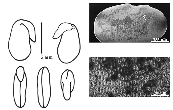 Seed: 1.5–3 mm long; 1–2 mm wide; 0.7–1.1 mm thick; not overgrown; not angular (except hilum); symmetrical (except hilum); circular, or oblong, or ovate, or reniform; compressed; without visible radicle and cotyledon lobes; without hilar sinus; without umbo on seed faces; without medial ridge on each face. Cuticle not exfoliating; not inflated; not wrinkled. Testa present; without pieces of adhering epicarp; not adhering to endocarp; free from endocarp; dull; not modified by a bloom; colored; monochrome; orange (reddish), or red (dish), or yellow (pale); glabrous; smooth; coriaceous. Pleurogram absent. Pseudopleurogram absent. Fracture lines absent. Rim absent. Wing(s) absent. Raphe not visible. Hilum present; visible; with faboid split; with the lips of the faboid split the same color as the rest of the hilum; punctiform; marginal according to radicle tip; flush; within halo; halo darker than testa. Lens discernible, or not discernible; with margins curved; circular (sub); not in groove of raphe; adjacent to hilum; mounded; dissimilar color from testa; darker than testa; black; not within corona, halo, or rim. Endosperm present; thick, or thin; not pluglike and not resembling tip of radicle; covering entire embryo; adnate to testa. Cotyledons smooth; both outer faces convex; both the same thickness; both more or less of equal length; not folded; margin entire 180 degrees from base of radicle; similar at apex; not concealing radicle; entire over radicle; without lobes; with the interface division terminating at base of radicle; without margins recessed; yellow; inner face flat; glabrous on inner face. Embryonic axis deflexed; parallel to length of seed; without a joint evident between the radicle and the cotyledons. Radicle differentiated from cotyledon; bulbose; deflexed and parallel to cotyledon length; centered between cotyledons; less than 1/2 length of cotyledons to 1/2 to nearly length of cotyledons. Plumule rudimentary, or moderately developed; glabrous.