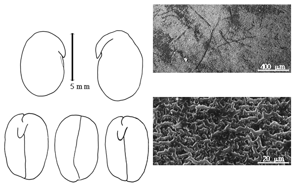 Seed: 7–10 mm long; 4–5.8 mm wide; 2.8–5.3 mm thick; not overgrown; not angular; symmetrical; elliptic to oblong; terete to compressed; with surface smooth; without visible radicle and cotyledon lobes; without hilar sinus; without umbo on seed faces; without medial ridge on each face. Cuticle not exfoliating; not inflated; not wrinkled. Testa present; without pieces of adhering epicarp; not adhering to endocarp; free from endocarp; dull; not modified by a bloom; colored; monochrome, or mottled; with frequent mottles; dark to pale brown or brown; with brown overlay (darker); glabrous; smooth; coriaceous. Pleurogram absent. Pseudopleurogram absent. Fracture lines absent. Rim absent. Wing(s) absent. Raphe visible, or not visible; from hilum through lens and base of seed to point opposite hilum; not bifurcating; color of testa; raised. Hilum present; fully concealed; concealed by funicular remnant; without faboid split; larger than punctiform; 0.7–1 mm long; with curved outline; elliptic; apical according to radicle tip but marginal according to seed length; recessed; within rim; rim color darker than testa. Lens discernible, or not discernible; 0.8–1 mm long; with margins straight; linear; not in groove of raphe; confluent with hilum; recessed; similar color as testa; lighter than testa, or darker than testa; brown; within rim; rim color lighter than testa, or darker than testa. Endosperm absent. Cotyledons smooth, or not smooth; both outer faces convex; both the same thickness; both more or less of equal length; not folded; margin entire 180 degrees from base of radicle; similar at apex; not concealing radicle; notched at radicle; without lobes; with the interface division terminating at base of radicle; without margins recessed; yellow; inner face flat; glabrous on inner face. Embryonic axis oblique; oblique to length of seed; without a joint evident between the radicle and the cotyledons. Radicle differentiated from cotyledon; triangular; lobe tip straight; oblique to cotyledons; centered between cotyledons; less than 1/2 length of cotyledons. Plumule rudimentary; glabrous.