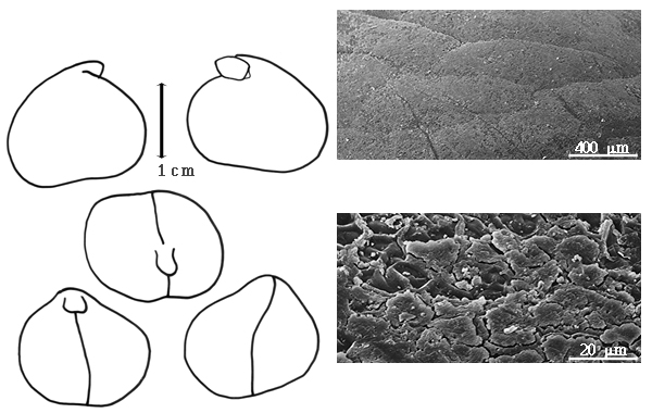 Seed: 13–20 mm long; 13–19 mm wide; 11–18 mm thick; not overgrown; not angular; symmetrical; circular, or elliptic (broadly); terete; with surface smooth; without visible radicle and cotyledon lobes; without hilar sinus; without umbo on seed faces; without medial ridge on each face. Cuticle not exfoliating; not inflated; not wrinkled. Testa present; without pieces of adhering epicarp; not adhering to endocarp; free from endocarp; glossy to dull; not modified by a bloom; colored; monochrome; black to brown; glabrous; smooth, or not smooth; with elevated features; wrinkled; coriaceous. Pleurogram absent. Pseudopleurogram absent. Fracture lines present, or absent; reticulate. Rim absent. Wing(s) absent. Raphe not visible. Hilum present; visible, or partially concealed, or fully concealed; concealed by funicular remnant, or aril; with faboid split; with the lips of the faboid split the same color as the rest of the hilum; larger than punctiform; 13–25 mm long; with straight outline; linear; marginal according to radicle tip; flush; within rim; rim color of testa. Lens discernible; 2–4 mm long; with margins straight; linear; not in groove of raphe; confluent with hilum; flush; same color as testa; brown; within rim; rim color of testa. Endosperm absent. Cotyledons smooth, or not smooth; wrinkled; both outer faces convex; both the same thickness; both more or less of equal length; with both folded, or not folded; sufficiently folded for inner face to touch itself; portions of inner folded face unequal; margin entire 180 degrees from base of radicle, or not entire 180 degrees from base of radicle; notched; similar at apex; partially concealing radicle; notched at radicle; without lobes; with the interface division terminating at base of radicle; with margin(s) recessed; with 1 margin recessed; recessed on same side as radicle; tan; inner face flat; glabrous on inner face. Embryonic axis oblique; oblique to length of seed; without a joint evident between the radicle and the cotyledons. Radicle differentiated from cotyledon; bulbose; lobe tip straight; oblique to cotyledons; centered between cotyledons; less than 1/2 length of cotyledons. Plumule rudimentary; glabrous.