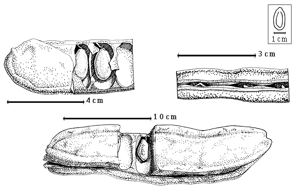 Seed: 20–25 mm long; 8–13 mm wide; 5–6 mm thick; not overgrown; not angular; symmetrical; ovate to oblong; compressed; with surface smooth; without visible radicle and cotyledon lobes; without hilar sinus; without umbo on seed faces; without medial ridge on each face. Cuticle not exfoliating; not inflated; not wrinkled. Testa present; without pieces of adhering epicarp; not adhering to endocarp; free from endocarp; dull; not modified by a bloom; colored; monochrome; brown; glabrous; smooth; osseous. Pleurogram present; 90 %. Pseudopleurogram absent. Fracture lines present; reticulate. Rim absent. Wing(s) absent. Raphe not visible. Hilum present; fully concealed; concealed by funicular remnant; without faboid split; punctiform; subapical to radicle tip; flush; not within corona, halo, or rim. Lens discernible; 0.1–0.5 mm long; with margins curved; elliptic; not in groove of raphe; flush (or nearly so); dissimilar color from testa; black (sometimes center tan); not within corona, halo, or rim. Endosperm present; thick; not pluglike and not resembling tip of radicle; adnate to embryo. Cotyledons smooth; both outer faces convex; both the same thickness; both more or less of equal length; not folded; margin entire 180 degrees from base of radicle; similar at apex; partially concealing radicle; with lobes; with lobes not touching; with the interface division terminating at base of radicle; without margins recessed; inner face flat; glabrous on inner face. Embryonic axis straight; parallel to length of seed; without a joint evident between the radicle and the cotyledons. Radicle differentiated from cotyledon; centered between cotyledons. Plumule moderately developed; glabrous.