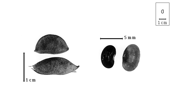 Fruit: A legume; unilocular; 1.9 cm long; 0.8 cm wide; 0.5 cm thick; length less than twice as long as width, or 2–9 times longer than wide; with deciduous androecial sheath; without orifice formed by curving of fruit or fruit segments; straight; not plicate; not twisted; asymmetrical; fusiform, or reniform; with both sutures unequally curved, or both sutures parallelly curved; not inflated; compressed; with beak; straight, or declined; with solid beak the same color and texture as fruit; tapered at apex to short tapered at apex; aligned with longitudinal axis of fruit; tapered at base, or short tapered at base; aligned with longitudinal axis of fruit; with the apex and base uniform in texture; coriaceous; seed chambers externally visible; seed chambers with the raised seed chambers not torulose; margin not constricted; margin without sulcus; margin plain; wing(s) absent; nonstipitate; with all layers dehiscing; splitting along suture(s). Dehiscence of valves along both sutures; assumed apical and down; active; with valves breaking. Replum invisible. Epicarp dull; monochrome; brown to yellow; with surface texture uniform; pubescent and indurate; with hairs erect; with 2 types of pubescence; puberulent; with pubescence golden; with pubescence uniformly distributed; with simple hairs and glandular hairs; pliable; with hair bases swollen and plain; glandular; with glandular hairs; without spines; smooth, or not smooth; with elevated features; veined, or not veined; reticulately veined; not tuberculate; glandular dotted; not exfoliating; without cracks; without embedded tissue, much thicker than epicarp, running from base to apex. Mesocarp present; thin; 1-layered; without balsamic vesicles; without fibers; without reniform canals; mealy; chartaceous. Endocarp present; visible; dull; opaque; mottled; with mottling more or less uniform (dark); with tan overlay; smooth; without adhering pieces of testa; nonseptate; chartaceous; not exfoliating; remaining fused to mesocarp and epicarp; without wings; entire. Seed(s) 1, or 2; length parallel with fruit length; neither overlapping nor touching; in 1 series. Funiculus of 1 length only; flattened; triangular. Aril present; dry; when dry 2-lipped rim-aril; entire; without tongue (or flap) on lips of 2-lipped rim-aril, or with tongues (or flap) on lips of 2-lipped rim-aril; with 1 tongue or flap on 1 lip of 2-lipped rim-aril; cream, or white.