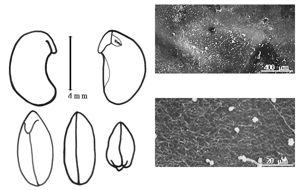 Seed: 6–9.5 mm long; 4–6 mm wide; 3–5.5 mm thick; not overgrown; not angular; symmetrical; reniform; terete; with surface smooth; without visible radicle and cotyledon lobes; without hilar sinus; without umbo on seed faces; without medial ridge on each face. Cuticle not exfoliating; not inflated; not wrinkled. Testa present; without pieces of adhering epicarp; not adhering to endocarp; free from endocarp; dull; not modified by a bloom; colored; mottled; with frequent mottles; dark brown, or green; with black overlay, or brown overlay; glabrous; smooth; coriaceous. Pleurogram absent. Pseudopleurogram absent. Fracture lines absent. Rim absent. Wing(s) absent. Raphe not visible. Hilum present; visible; with faboid split; with the lips of the faboid split the same color as the rest of the hilum; larger than punctiform; 1–2 mm long; with curved outline; elliptic; apical according to radicle tip but marginal according to seed length; recessed; within rim; rim color of testa. Lens discernible; 0.7–1 mm long; with margins curved; elliptic; not in groove of raphe; confluent with hilum; flush; dissimilar color from testa; darker than testa; black; not within corona, halo, or rim. Endosperm present; trace; not pluglike and not resembling tip of radicle; restricted to region of embryo; adnate to testa. Cotyledons smooth; both outer faces convex; both the same thickness; both more or less of equal length; not folded; margin entire 180 degrees from base of radicle; similar at apex; partially concealing radicle; notched at radicle; without lobes; with the interface division terminating at base of radicle; with margin(s) recessed, or without margins recessed; with 1 margin recessed; recessed on same side as radicle; pale tan; inner face flat; glabrous on inner face. Embryonic axis oblique; oblique to length of seed; without a joint evident between the radicle and the cotyledons. Radicle differentiated from cotyledon; linear; lobe tip straight; deflexed and parallel to cotyledon length, or oblique to cotyledons; centered between cotyledons; less than 1/2 length of cotyledons. Plumule moderately developed; glabrous.