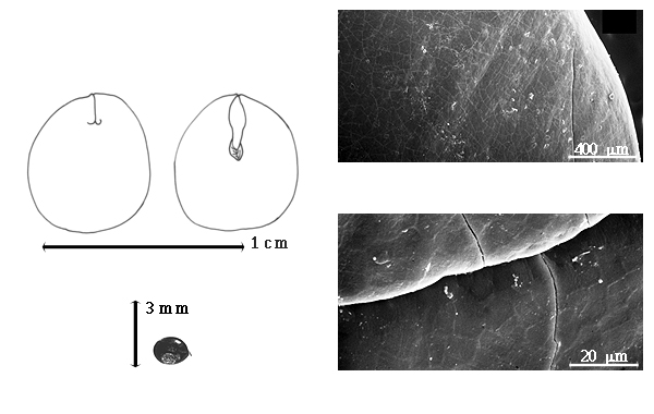 Seed: 6–7 mm long; 4.5–5 mm wide; 2–3 mm thick; not overgrown; not angular; symmetrical; elliptic; compressed; with surface smooth; without visible radicle and cotyledon lobes; without hilar sinus; without umbo on seed faces; without medial ridge on each face. Cuticle not exfoliating; not inflated; not wrinkled. Testa present; without pieces of adhering epicarp; not adhering to endocarp; free from endocarp; glossy; not modified by a bloom; colored; monochrome; black; glabrous; not smooth; with recessed features; shallowly pitted with small separate pits (in areola); osseous. Pleurogram present; 90 %. Pseudopleurogram absent. Fracture lines present. Rim absent. Wing(s) absent. Raphe not visible. Hilum present; fully concealed; concealed by funicular remnant; without faboid split; punctiform; subapical to radicle tip (almost apical); flush; not within corona, halo, or rim. Lens not discernible. Endosperm absent. Cotyledons smooth; both outer faces flat; both the same thickness; both more or less of equal length; not folded; margin entire 180 degrees from base of radicle; similar at apex; completely concealing radicle; with lobes; with lobes overlapping; with basal groin formed by lobes; with the interface division terminating at base of radicle; without margins recessed; inner face flat; glabrous on inner face. Embryonic axis straight; parallel to length of seed; without a joint evident between the radicle and the cotyledons. Radicle differentiated from cotyledon; straight with embryonic axis; centered between cotyledons. Plumule well developed; glabrous.