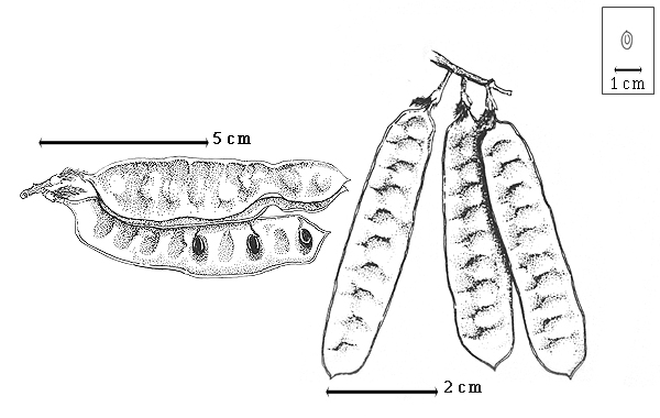 Fruit: A legume; unilocular; 7–12.5 cm long; 1.5–2.5 cm wide; 0.3–0.4 cm thick; 2–9 times longer than wide; with deciduous androecial sheath; with deciduous corolla; with deciduous calyx; without orifice formed by curving of fruit or fruit segments; straight; not plicate; not twisted; symmetrical; oblong to linear (broadly); not inflated; compressed; without beak; short tapered at apex to rounded at apex; aligned with longitudinal axis of fruit; short tapered at base; aligned with longitudinal axis of fruit; with the apex and base uniform in texture; coriaceous; seed chambers externally visible; margin not constricted to constricted; margin constricted along both margins (irregular once constricted); margin without sulcus; margin plain; wing(s) absent; substipitate; with all layers dehiscing (or tardily dehiscent), or indehiscent; splitting along suture(s). Dehiscence of valves along both sutures (splitting, remaining attached to sutures); apical and down; passive. Replum invisible. Epicarp dull; monochrome; brown; with surface texture uniform; glabrous to pubescent and indurate; with hairs erect; with simple hairs; eglandular; without spines; not smooth; with elevated features; veined, or not veined; transversely veined relative to fruit length (parallel reticulation tending to anastomose near midvalve); not tuberculate; not exfoliating; without cracks; without embedded tissue, much thicker than epicarp, running from base to apex. Mesocarp absent. Endocarp present; visible; dull; opaque; monochrome; tan; smooth; without adhering pieces of testa; septate to nonseptate; not exfoliating; entire. Seed(s) 1–14; length transverse to fruit length; neither overlapping nor touching; in 1 series. Funiculus up to 8 mm long; of 3 different lengths; thick; hooked to plicate. Aril absent.