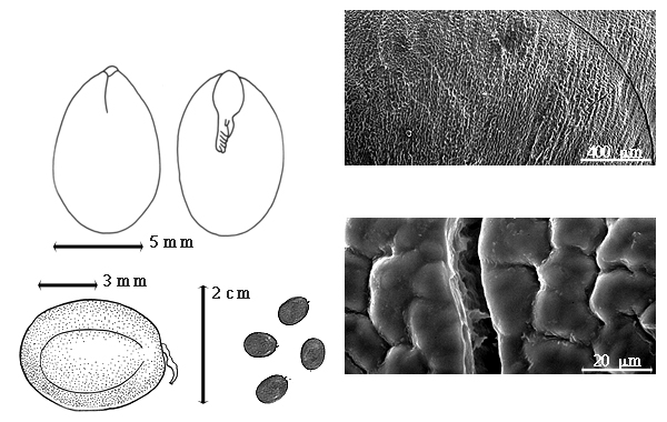 Seed: 4–13 mm long; 3–9 mm wide; 3–4 mm thick; not overgrown; not angular; symmetrical; ovate to elliptic, or oblong; compressed; with surface smooth; without visible radicle and cotyledon lobes; without hilar sinus; without umbo on seed faces; without medial ridge on each face. Cuticle not exfoliating; not inflated; not wrinkled. Testa present; without pieces of adhering epicarp; not adhering to endocarp; free from endocarp; glossy; not modified by a bloom; colored; monochrome; black; glabrous; not smooth; with recessed features; minutely pitted with small separate pits; osseous. Pleurogram present; 90 %. Pseudopleurogram absent. Fracture lines present. Rim absent. Wing(s) absent. Raphe not visible. Hilum present; fully concealed; concealed by funicular remnant; without faboid split; punctiform; apical at apex of radicle tip; flush; not within corona, halo, or rim. Lens discernible; 0.3–0.4 mm long; with margins curved; elliptic to circular; not in groove of raphe; mounded; same color as testa; black; not within corona, halo, or rim. Endosperm present; thick; not pluglike and not resembling tip of radicle; adnate to testa. Cotyledons smooth; both outer faces flat; both the same thickness; both more or less of equal length; not folded; margin entire 180 degrees from base of radicle; similar at apex; partially concealing radicle; split over radicle; with the interface division terminating at base of radicle; without margins recessed; inner face flat; glabrous on inner face. Embryonic axis straight; parallel to length of seed; without a joint evident between the radicle and the cotyledons. Radicle differentiated from cotyledon; straight with embryonic axis; centered between cotyledons. Plumule well developed; glabrous.