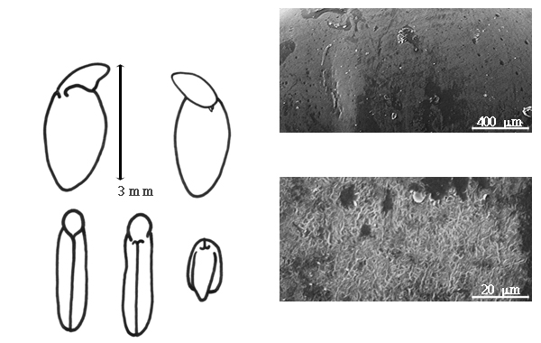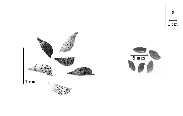 Seed: 4–4.2 mm long; 2–2.4 mm wide; 1.8–2 mm thick; not overgrown; not angular; asymmetrical; elliptic; terete; with visible radicle and cotyledon lobes; without external groove between radicle and cotyledon lobes; without hilar sinus; without umbo on seed faces; without medial ridge on each face. Cuticle not exfoliating; not inflated; not wrinkled. Testa present; without pieces of adhering epicarp; not adhering to endocarp; free from endocarp; glossy (primarily caused by glandular exudate); not modified by a bloom; colored; monochrome; tan; glabrous; smooth; coriaceous. Pleurogram absent. Pseudopleurogram absent. Fracture lines absent. Rim absent. Raphe visible; from hilum to near base of seed and terminating; not bifurcating; darker than testa; brown; raised. Hilum present; visible; with faboid split; with the lips of the faboid split the same color as the rest of the hilum; punctiform; between cotyledon and radicle lobe; recessed; within corona; corona color darker than testa. Lens not discernible. Endosperm present; thin; not pluglike and not resembling tip of radicle; covering entire embryo; adnate to testa. Cotyledons not smooth; both outer faces convex; both the same thickness; both more or less of equal length; not folded; margin not entire 180 degrees from base of radicle; similar at apex; completely concealing radicle; entire over radicle; without lobes; with the interface division terminating at base of radicle; without margins recessed; yellow; inner face flat; glabrous on inner face. Embryonic axis deflexed; oblique to length of seed; without a joint evident between the radicle and the cotyledons. Radicle differentiated from cotyledon; linear; lobe tip curved; deflexed and parallel to cotyledon width; centered between cotyledons; less than 1/2 length of cotyledons. Plumule rudimentary; glabrous.