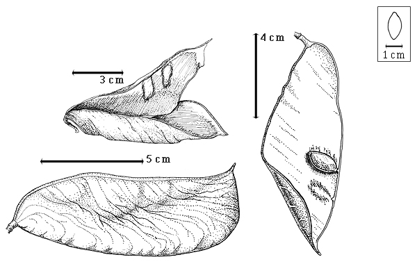 Fruit: A legume; unilocular; 9–11 cm long; 3.5–4.5 cm wide; 0.7–1 cm thick; 2–9 times longer than wide; with deciduous androecial sheath; with deciduous corolla; with deciduous calyx; without orifice formed by curving of fruit or fruit segments; straight to curved; not plicate; twisted; asymmetrical; with 1 straight and 1 curved suture (except near the base); scimitar-shaped or widest near apex; not inflated; flattened; without beak; short tapered at apex; right-angled with longitudinal axis of fruit; rounded at base; right angled with longitudinal axis of fruit; with the apex and base uniform in texture; ligneous; seed chambers externally invisible; margin not constricted; margin without sulcus; margin plain; wing(s) absent; substipitate; with all layers dehiscing; splitting along suture(s). Dehiscence of valves along both sutures; active; with valves separately enrolling. Replum invisible. Epicarp dull; monochrome; brown; with surface texture uniform; glabrous; eglandular; without spines; not smooth; with elevated features; veined; reticulately veined; not tuberculate; not exfoliating; without cracks; without embedded tissue, much thicker than epicarp, running from base to apex. Mesocarp present; surface not veined; 2-layered; without balsamic vesicles; with fibers; without reniform canals; with fibers oblique over solid layer; ligneous. Endocarp present; visible; dull; opaque; monochrome; brown; without adhering pieces of testa; nonseptate; not exfoliating; remaining fused to mesocarp and epicarp; entire. Seed(s) 1–4; length transverse to fruit length; neither overlapping nor touching; in 1 series. Funiculus 0.1–3 mm long; of 1 length only; thick; straight. Aril absent.