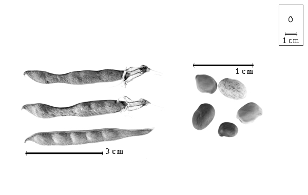 Seed: 3–6 mm long; 2.5–3.5 mm wide; 2–2.6 mm thick; not overgrown; not angular, or angular; asymmetrical; oblong, or quadrangular, or reniform (somewhat); compressed, or terete; with surface smooth; with visible radicle and cotyledon lobes, or without visible radicle and cotyledon lobes; without external groove between radicle and cotyledon lobes; without hilar sinus; without umbo on seed faces; without medial ridge on each face. Cuticle not exfoliating; not inflated; not wrinkled. Testa present; without pieces of adhering epicarp; not adhering to endocarp; free from endocarp; dull; not modified by a bloom; colored; monochrome, or mottled and streaked; with frequent mottles; with frequent streaks; brown (reddish); with black overlay, or purple overlay; glabrous; smooth; coriaceous. Pleurogram absent. Pseudopleurogram absent. Fracture lines absent. Rim absent. Wing(s) absent. Raphe not visible. Hilum present; visible; with faboid split; with the lips of the faboid split the same color as the rest of the hilum; punctiform, or larger than punctiform; 0.3–0.5 mm long; with curved outline; circular, or elliptic; marginal according to radicle tip, or between cotyledon and radicle lobe; recessed; within rim; rim color of testa, or darker than testa (to blackish). Lens discernible (obscure), or not discernible; 0.5–1 mm long; with margins straight; linear; not in groove of raphe; adjacent to hilum; 0.7 mm from hilum; flush; same color as testa, or dissimilar color from testa; darker than testa; brown (reddish); not within corona, halo, or rim. Endosperm present; thin; not pluglike and not resembling tip of radicle; covering entire embryo; adnate to testa. Cotyledons smooth; both outer faces convex; both the same thickness; both more or less of equal length; not folded; margin entire 180 degrees from base of radicle; similar at apex; partially concealing radicle; notched at radicle; with lobes; with lobes not touching; without basal groin formed by lobes; with the interface division terminating at base of radicle; with margin(s) recessed; yellow; inner face flat; glabrous on inner face. Embryonic axis deflexed; oblique to length of seed; without a joint evident between the radicle and the cotyledons. Radicle differentiated from cotyledon; bulbose; lobe tip straight; deflexed and parallel to cotyledon length; centered between cotyledons; less than 1/2 length of cotyledons. Plumule rudimentary; glabrous.
