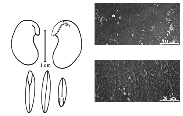 Seed: 9–15 mm long; 6–10 mm wide; 2–4 mm thick; not overgrown; not angular; symmetrical; reniform to oblong; compressed to flattened; with surface wrinkled; without visible radicle and cotyledon lobes; with deep hilar sinus; without umbo on seed faces; without medial ridge on each face. Cuticle not exfoliating; not inflated; not wrinkled. Testa present; with pieces of adhering epicarp; not adhering to endocarp; free from endocarp; glossy to dull; not modified by a bloom; colored; monochrome; reddish to dark brown; glabrous; smooth; chartaceous. Pleurogram absent. Pseudopleurogram absent. Fracture lines absent. Rim absent. Wing(s) absent. Raphe visible, or not visible (when testa dark brown); from hilum through lens and terminating before base of seed; not bifurcating; color of testa, or darker than testa; dark brown; flush. Hilum present; visible; with faboid split; with the lips of the faboid split the same color as the rest of the hilum; larger than punctiform; 0.8–1 mm long; with curved outline; elliptic; apical according to radicle tip but marginal according to seed length; recessed; not within corona, halo, or rim. Lens discernible; 0.8–1 mm long; with margins straight; triangular; not in groove of raphe; adjacent to hilum; ca. 0.2 mm from hilum; flush; similar color as testa; darker than testa; reddish to dark brown; not within corona, halo, or rim. Endosperm present; thin; not pluglike and not resembling tip of radicle; covering entire embryo, or covering at least 1/2 of embryo, but not entire embryo; adnate to testa. Cotyledons smooth; both outer faces convex; both the same thickness; both more or less of equal length; not folded; margin entire 180 degrees from base of radicle; similar at apex; not concealing radicle; entire over radicle; without lobes; with the interface division terminating at base of radicle; without margins recessed; tan; inner face flat; glabrous on inner face. Embryonic axis oblique; oblique to length of seed; without a joint evident between the radicle and the cotyledons. Radicle differentiated from cotyledon; bulbose; lobe tip straight; oblique to cotyledons; centered between cotyledons; less than 1/2 length of cotyledons. Plumule moderately developed; glabrous.