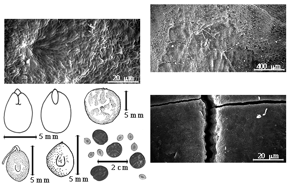 Seed: 6–20 mm long; 4–15 mm wide; 1–3 mm thick; not overgrown; not angular; symmetrical; elliptic to circular (sub); compressed; with surface smooth; without visible radicle and cotyledon lobes; without hilar sinus; without umbo on seed faces; without medial ridge on each face. Cuticle not exfoliating; not inflated; not wrinkled. Testa present; without pieces of adhering epicarp; not adhering to endocarp; free from endocarp; dull to glossy; not modified by a bloom; colored; monochrome; blackish brown to tan, or black; glabrous; smooth, or not smooth; with elevated features; when raised rugose; osseous to chartaceous. Pleurogram present, or absent; 75 %. Pseudopleurogram absent. Fracture lines present, or absent. Rim absent. Wing(s) absent. Raphe not visible. Hilum present; visible; without faboid split; punctiform; apical at apex of radicle tip; flush; not within corona, halo, or rim. Lens discernible; 0.2–0.5 mm long; with margins straight, or curved; linear; elliptic; not in groove of raphe; flush (to nearly so); same color as testa, or similar color as testa, or dissimilar color from testa; lighter than testa, or darker than testa; tan; not within corona, halo, or rim. Endosperm present, or absent; when present thick; not pluglike and not resembling tip of radicle; adnate to testa. Cotyledons not smooth; rugose; both outer faces flat; both the same thickness; both more or less of equal length; not folded; margin entire 180 degrees from base of radicle; similar at apex; partially concealing radicle, or not concealing radicle; notched at radicle; with lobes; with lobes touching (auriculate); without basal groin formed by lobes; with the interface division terminating at base of radicle; without margins recessed; inner face flat; glabrous on inner face. Embryonic axis straight; parallel to length of seed; without a joint evident between the radicle and the cotyledons. Radicle differentiated from cotyledon; straight with embryonic axis; centered between cotyledons. Plumule well developed to rudimentary; glabrous.