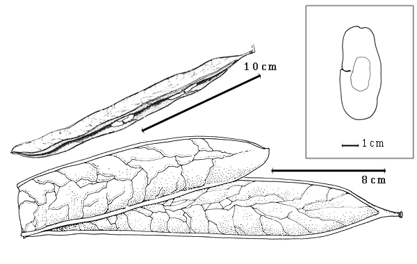 Fruit: A legume; unilocular; 25–36 cm long; 2–3.5 cm wide; 0.2–0.4 cm thick; more than 9 times longer than wide; with deciduous androecial sheath; with deciduous corolla; with deciduous calyx; without orifice formed by curving of fruit or fruit segments; straight to curved; not plicate; not twisted; symmetrical; broadly linear; not inflated; flattened; without beak; short tapered at apex; right-angled with longitudinal axis of fruit; short tapered at base to rounded at base (nearly); aligned with longitudinal axis of fruit; with the apex and base uniform in texture; coriaceous; seed chambers externally invisible; margin not constricted; margin without sulcus; margin plain; wing(s) absent; stipitate; with the stipe up to 10 mm long; with all layers dehiscing; splitting along suture(s). Dehiscence of valves along 1 suture (along ventral suture and remaining united along dorsal suture); medial and up and down; passive. Replum invisible. Epicarp dull; monochrome; dark brown; with surface texture uniform; glabrous; eglandular; without spines; not smooth; with elevated features; not veined, or veined; on the ventral half of valves regularly and obliquely veined relative to fruit length and irregularly veined (on the dorsal half of valves); not tuberculate; not exfoliating; without cracks; without embedded tissue, much thicker than epicarp, running from base to apex. Mesocarp absent. Endocarp present; visible; dull; opaque; monochrome; reddish brown; smooth; without adhering pieces of testa; nonseptate; not exfoliating; entire. Seed(s) 6–14; length parallel with fruit length; overlapping; in 1 series. Funiculus 10–20 mm long; of 1 length only; filiform; S-curved. Aril absent.
