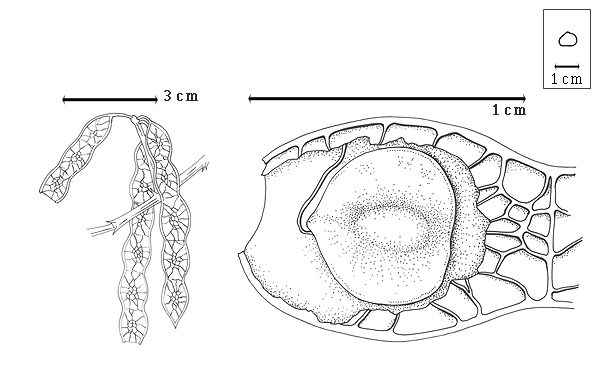 Fruit: A legume; unilocular; 8–9 cm long; 0.8–1.1 cm wide; 0.1–0.2 cm thick; 2–9 times longer than wide, or more than 9 times longer than wide; with deciduous androecial sheath; with deciduous corolla; with deciduous calyx; without orifice formed by curving of fruit or fruit segments; curved; not plicate; not twisted; symmetrical; linear; not inflated; compressed; without beak; short tapered at apex to rounded at apex; aligned with longitudinal axis of fruit; short tapered at base; aligned with longitudinal axis of fruit; with the apex and base uniform in texture; coriaceous; seed chambers externally visible; margin constricted; margin constricted along both margins; margin without sulcus; margin plain; wing(s) absent; stipitate; with the stipe up to 10 mm long; indehiscent (, segmented and separating transversely into 1-seeded segments, remaining attached to sutures). Replum invisible. Epicarp dull; monochrome; brown; with surface texture uniform; glabrous; eglandular; without spines; not smooth; with elevated features; veined; reticulately veined; not tuberculate; not exfoliating; without cracks; without embedded tissue, much thicker than epicarp, running from base to apex. Mesocarp absent. Endocarp present; visible; dull; opaque; monochrome; tan; smooth; without adhering pieces of testa; nonseptate; not exfoliating; entire. Seed(s) 3–9; length parallel with fruit length; neither overlapping nor touching; in 1 series. Funiculus to 10 mm long; of 1 length only; filiform; curved. Aril absent.