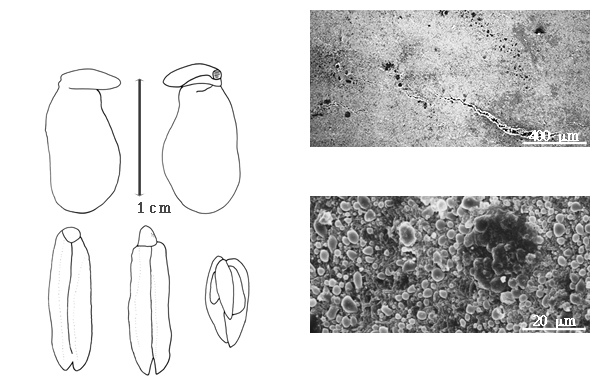 Seed: 12–18 mm long; 8–10.5 mm wide; 4–6.5 mm thick; not overgrown; not angular; asymmetrical; irregularly ovate; compressed; with surface smooth; without visible radicle and cotyledon lobes; without hilar sinus; with umbo on seed faces; with umbo on both faces of seed; without medial ridge on each face. Cuticle not exfoliating; not inflated; not wrinkled. Testa present; without pieces of adhering epicarp; not adhering to endocarp; free from endocarp; dull; not modified by a bloom; colored; mottled; with infrequent mottles; tan; with brown overlay; glabrous; smooth; chartaceous. Pleurogram absent. Pseudopleurogram absent. Fracture lines absent. Rim absent. Wing(s) absent. Raphe visible; from hilum through lens to base of seed and bifurcating; bifurcating at base of seed with each arm going up antiraphe side turning (U-shaped) down and approaching bifurcation; color of testa and darker than testa; brown; flush. Hilum present; visible; with faboid split; with the lips of the faboid split the same color as the rest of the hilum; larger than punctiform; 1–1.2 mm long; with curved outline; elliptic; apical according to radicle tip but marginal according to seed length; recessed; not within corona, halo, or rim. Lens discernible; 2–2.5 mm long; with margins straight; linear; not in groove of raphe; confluent with hilum; flush; similar color as testa; darker than testa; not within corona, halo, or rim. Endosperm present; thin; not pluglike and not resembling tip of radicle; covering entire embryo; adnate to testa. Cotyledons smooth; both outer faces convex; both the same thickness; both more or less of equal length; not folded; margin entire 180 degrees from base of radicle; similar at apex; partially concealing radicle; notched at radicle; without lobes; with the interface division terminating at base of radicle; without margins recessed; pale yellow; inner face flat; glabrous on inner face. Embryonic axis right angled; oblique to length of seed; without a joint evident between the radicle and the cotyledons. Radicle differentiated from cotyledon; linear; lobe tip slightly curved; with 90 degree turn; centered between cotyledons; less than 1/2 length of cotyledons. Plumule rudimentary; glabrous.