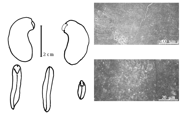 Seed: 22–23 mm long; 13–14 mm wide; 2–4 mm thick; not overgrown; not angular; asymmetrical; reniform; flattened; with surface smooth; without visible radicle and cotyledon lobes; with deep hilar sinus; without umbo on seed faces; without medial ridge on each face. Testa present; without pieces of adhering epicarp; not adhering to endocarp; free from endocarp; dull; not modified by a bloom; colored; monochrome; dark brown; glabrous; not smooth; with recessed features; pitted with small separate pits; chartaceous. Pleurogram absent. Pseudopleurogram absent. Fracture lines absent. Rim absent. Wing(s) absent. Raphe not visible. Hilum present; partially concealed; concealed by aril; with faboid split; with the lips of the faboid split the same color as the rest of the hilum; larger than punctiform; ac. 3 mm long; with curved outline; elliptic to circular; apical according to radicle tip but marginal according to seed length; recessed; within rim; rim color of testa. Lens discernible; ca. 3 mm long; with margins straight; linear; not in groove of raphe; adjacent to hilum; ca. 1 mm from hilum; flush; same color as testa; brown; not within corona, halo, or rim. Endosperm absent. Cotyledons smooth; both outer faces convex; both the same thickness; both more or less of equal length; not folded; margin entire 180 degrees from base of radicle; similar at apex; partially concealing radicle; notched at radicle; without lobes; with the interface division terminating at base of radicle; without margins recessed; tan; inner face flat; glabrous on inner face. Embryonic axis oblique; oblique to length of seed to perpendicular to length of seed; without a joint evident between the radicle and the cotyledons. Radicle differentiated from cotyledon; bulbose; lobe tip slightly curved; oblique to cotyledons; centered between cotyledons; less than 1/2 length of cotyledons. Plumule moderately developed; glabrous.