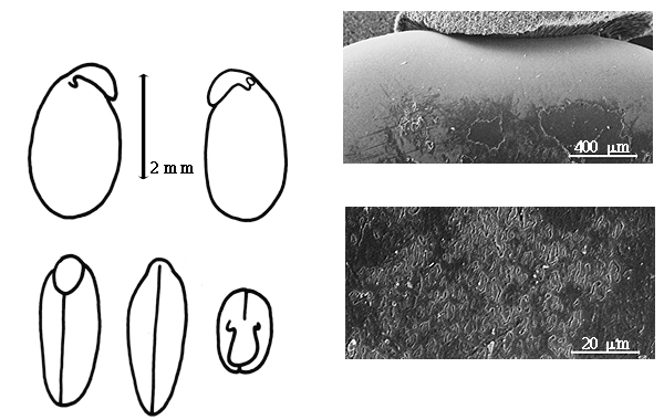 Seed: 2.5–4 mm long; 1.6–2.5 mm wide; 1.5–1.7 mm thick; not overgrown; not angular; asymmetrical; elliptic, or ovate; compressed; without visible radicle and cotyledon lobes; without hilar sinus; with umbo on seed faces; without medial ridge on each face. Cuticle not exfoliating; not inflated; not wrinkled. Testa present; without pieces of adhering epicarp; not adhering to endocarp; free from endocarp; dull; not modified by a bloom; colored; monochrome, or mottled; with frequent mottles; reddish to dark (nearly black) reddish brown; with black overlay; glabrous; smooth; coriaceous. Pleurogram absent. Pseudopleurogram absent. Fracture lines absent. Rim absent. Wing(s) absent. Raphe not visible. Hilum present; fully concealed; concealed by aril; with faboid split; with the lips of the faboid split the same color as the rest of the hilum; larger than punctiform; 1.3 mm long; with straight outline; oblong; marginal according to radicle tip; flush; not within corona, halo, or rim. Lens discernible; with margins curved; circular; not in groove of raphe; confluent with hilum (at least hilar rim); flush; dissimilar color from testa; darker than testa; black; not within corona, halo, or rim. Endosperm present; thin; not pluglike and not resembling tip of radicle; covering entire embryo; adnate to testa. Cotyledons smooth; both outer faces convex; both the same thickness; both more or less of equal length; not folded; margin entire 180 degrees from base of radicle; similar at apex; not concealing radicle; entire over radicle; without lobes; with the interface division terminating at base of radicle; without margins recessed; yellow; inner face flat; glabrous on inner face. Embryonic axis deflexed; oblique to length of seed; without a joint evident between the radicle and the cotyledons. Radicle differentiated from cotyledon; linear; deflexed and parallel to cotyledon length; centered between cotyledons; less than 1/2 length of cotyledons. Plumule rudimentary; glabrous.