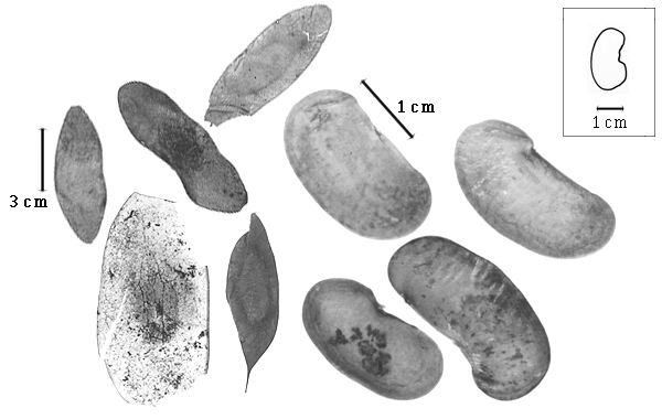 Seed: 7–20 mm long; 3–10 mm wide; 1.5 mm thick; not overgrown; not angular; asymmetrical; reniform (to subreniform); flattened; with surface smooth; without visible radicle and cotyledon lobes; without hilar sinus; without umbo on seed faces; without medial ridge on each face. Cuticle not exfoliating; not inflated; not wrinkled. Testa present; without pieces of adhering epicarp; not adhering to endocarp; free from endocarp; dull; not modified by a bloom; colored; monochrome; brown (to greenish); glabrous; smooth, or not smooth; with elevated features; wrinkled (slightly); chartaceous. Pleurogram absent. Pseudopleurogram absent. Fracture lines absent. Rim absent. Wing(s) absent. Raphe visible (faintly), or not visible; from hilum to lens; not bifurcating; darker than testa (slightly); brown (to greenish); raised. Hilum present; fully concealed; concealed by funicular remnant; without faboid split; punctiform; marginal according to radicle tip; flush; not within corona, halo, or rim. Lens discernible (faintly), or not discernible; with margins straight, or curved; oblong; oblong; not in groove of raphe; adjacent to hilum; 0.1–8 mm from hilum; mounded; dissimilar color from testa; darker than testa; black; not within corona, halo, or rim. Endosperm absent. Cotyledons smooth; both outer faces convex; both the same thickness; both more or less of equal length; not folded; margin entire 180 degrees from base of radicle; similar at apex; partially concealing radicle, or not concealing radicle (almost); entire over radicle; without lobes, or with lobes; with lobes not touching; without basal groin formed by lobes; with the interface division terminating at base of radicle; without margins recessed; brown (reddish), or tan; inner face flat; glabrous on inner face. Embryonic axis deflexed; oblique to length of seed; without a joint evident between the radicle and the cotyledons. Radicle differentiated from cotyledon; bulbose; deflexed and parallel to cotyledon length; centered between cotyledons; less than 1/2 length of cotyledons. Plumule well developed; glabrous.