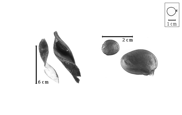 Seed: 11–27 mm long; 10–13 mm wide; 3–5 mm thick; not overgrown; not angular; symmetrical, or asymmetrical; nearly circular, or ovate (irregularly); compressed to flattened; with surface smooth; without visible radicle and cotyledon lobes; with shallow hilar sinus; without umbo on seed faces; without medial ridge on each face. Testa present; without pieces of adhering epicarp; not adhering to endocarp; free from endocarp; dull; not modified by a bloom; colored; monochrome; black to brown (dark); glabrous; not smooth; with elevated features, or recessed features; finely, transversely ridged; pitted with small separate pits; chartaceous. Pleurogram absent. Pseudopleurogram absent. Fracture lines absent. Rim absent. Wing(s) absent. Raphe not visible. Hilum present; partially concealed, or fully concealed; concealed by aril, or funicular remnant; with faboid split; with the lips of the faboid split lighter colored than the rest of the hilum and therefore conspicuous; larger than punctiform; 1.5–5 mm long; with curved outline; elliptic to fusiform; apical at apex of radicle tip, or apical according to radicle tip but marginal according to seed length; recessed; within rim, or not within corona, halo, or rim; rim color of testa. Lens barely discernible; 1–4 mm long; with margins straight; linear, or oblong; not in groove of raphe; confluent with hilum; mounded, or flush; same color as testa; black to brown; not within corona, halo, or rim. Endosperm absent. Cotyledons smooth, or not smooth; wrinkled; both outer faces convex; both the same thickness; both more or less of equal length; not folded; margin entire 180 degrees from base of radicle; similar at apex; not concealing radicle; entire over radicle; without lobes; with the interface division terminating at base of radicle; with margin(s) recessed; with 1 margin recessed; recessed on same side as radicle; tan; inner face flat; glabrous on inner face. Embryonic axis oblique to right angled; oblique to length of seed to perpendicular to length of seed; without a joint evident between the radicle and the cotyledons. Radicle differentiated from cotyledon; linear; lobe tip curved; oblique to cotyledons; centered between cotyledons; less than 1/2 length of cotyledons. Plumule rudimentary; glabrous.