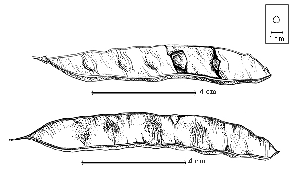 Polhill and Vidal (1981) described the seeds of Poeppigia as "compressed, ovate, shortly beaked, with faint closed areoles on both faces." There clearly are two parts to the face of a seed: Marginal, which is glossy, darker colored, and without fracture lines, and facial, which may be duller, lighter colored, and always with transverse fracture lines. There is no pleurogram.