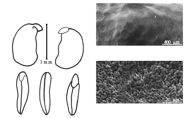 Seed: 1.5–3.5 mm long; 1–2 mm thick; not overgrown; not angular; asymmetrical; ovate, or reniform; flattened; with visible radicle and cotyledon lobes; without external groove between radicle and cotyledon lobes; without hilar sinus; without umbo on seed faces; without medial ridge on each face. Cuticle not exfoliating; not inflated; not wrinkled. Testa present; without pieces of adhering epicarp; not adhering to endocarp; free from endocarp; dull; not modified by a bloom; colored; monochrome; reddish brown; glabrous; not smooth; with recessed features; pitted with small separate pits; coriaceous. Pleurogram absent. Pseudopleurogram absent. Fracture lines absent. Rim absent. Wing(s) absent. Raphe not visible. Hilum present; partially concealed; concealed by funicular remnant; with faboid split; with the lips of the faboid split the same color as the rest of the hilum; punctiform; between cotyledon and radicle lobe; flush; within rim; rim color of testa. Lens discernible; with margins curved; circular; not in groove of raphe; adjacent to hilum; 0.4 mm from hilum; mounded; dissimilar color from testa; darker than testa; black (ish); not within corona, halo, or rim. Endosperm present; thin; not pluglike and not resembling tip of radicle; covering entire embryo; adnate to testa. Cotyledons smooth; both outer faces convex; both the same thickness; both more or less of equal length; not folded; margin entire 180 degrees from base of radicle; similar at apex; partially concealing radicle; split over radicle; with lobes; with lobes not touching; with the interface division terminating at base of radicle; without margins recessed; yellow; inner face flat; glabrous on inner face. Embryonic axis deflexed; oblique to length of seed; without a joint evident between the radicle and the cotyledons. Radicle differentiated from cotyledon; linear; lobe tip straight, or curved; deflexed and parallel to cotyledon width; centered between cotyledons; less than 1/2 length of cotyledons. Plumule rudimentary; glabrous.