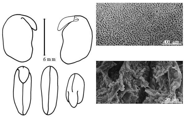 Seed: 6.5–9.5 mm long; 5–7 mm wide; 3–3.7 mm thick; not overgrown; not angular; asymmetrical; irregularly reniform; compressed; with surface smooth; without visible radicle and cotyledon lobes; without hilar sinus; without umbo on seed faces; without medial ridge on each face. Cuticle not exfoliating; not inflated; not wrinkled. Testa present; without pieces of adhering epicarp; not adhering to endocarp; free from endocarp; dull; not modified by a bloom; colored; mottled; with frequent mottles; brown; with black overlay; glabrous; not smooth; with elevated features; rugose; coriaceous. Pleurogram absent. Pseudopleurogram absent. Fracture lines absent. Rim absent. Raphe visible; from hilum through lens and base of seed to point opposite hilum; not bifurcating; darker than testa; black; raised. Hilum present; partially concealed; concealed by aril; with faboid split; with the lips of the faboid split the same color as the rest of the hilum; larger than punctiform; 1–1.6 mm long; with curved outline; elliptic; apical according to radicle tip but marginal according to seed length; recessed; within corona, or not within corona, halo, or rim; corona color lighter than testa. Lens discernible; 0.5–1.4 mm long; with margins straight; linear; not in groove of raphe; confluent with hilum; flush; similar color as testa; darker than testa; dark brown; within corona, or not within corona, halo, or rim; corona color darker than testa. Endosperm present; trace; not pluglike and not resembling tip of radicle; restricted to region of embryo; adnate to testa. Cotyledons not smooth; 1–3 grooves on each face; both outer faces convex; both the same thickness; both more or less of equal length; not folded; margin entire 180 degrees from base of radicle; similar at apex; partially concealing radicle; notched at radicle; without lobes; with the interface division terminating at base of radicle; with margin(s) recessed; with 1 margin recessed; recessed on same side as radicle; pale yellow; inner face flat; glabrous on inner face. Embryonic axis oblique; oblique to length of seed; without a joint evident between the radicle and the cotyledons. Radicle differentiated from cotyledon; bulbose; lobe tip curved; oblique to cotyledons; centered between cotyledons; less than 1/2 length of cotyledons. Plumule moderately developed; glabrous.