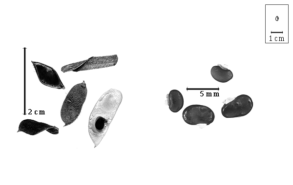 Seed: 4–8 mm long; 3–5 mm wide; 2–3 mm thick; not overgrown; not angular; asymmetrical; reniform to elliptic; compressed; with surface smooth; without visible radicle and cotyledon lobes; without hilar sinus; without umbo on seed faces; without medial ridge on each face. Cuticle not exfoliating; not inflated; not wrinkled. Testa present; without pieces of adhering epicarp; not adhering to endocarp; free from endocarp; slightly glossy; not modified by a bloom; colored; monochrome; reddish brown to brown; glabrous; smooth; chartaceous. Pleurogram absent. Pseudopleurogram absent. Fracture lines absent. Rim absent. Wing(s) absent. Raphe not visible. Hilum present; partially concealed; concealed by aril; with faboid split; with the lips of the faboid split the same color as the rest of the hilum; larger than punctiform; 1.5–2.5 mm long; with curved outline; elliptic; apical according to radicle tip but marginal according to seed length, or marginal according to radicle tip; flush to recessed; not within corona, halo, or rim, or within halo; halo darker than testa. Lens discernible; 0.5–1 mm long; with margins straight; linear; not in groove of raphe; confluent with hilum; flush; similar color as testa; darker than testa; not within corona, halo, or rim. Endosperm present; thin; not pluglike and not resembling tip of radicle; covering at least 1/2 of embryo, but not entire embryo; adnate to testa. Cotyledons smooth; both outer faces convex; both the same thickness; both more or less of equal length; not folded; margin entire 180 degrees from base of radicle; similar at apex; partially concealing radicle; split over radicle; without lobes; with the interface division terminating at base of radicle; without margins recessed; white to yellow; inner face flat; glabrous on inner face. Embryonic axis straight; oblique to length of seed; without a joint evident between the radicle and the cotyledons. Radicle differentiated from cotyledon; linear; lobe tip curved; oblique to cotyledons; centered between cotyledons; less than 1/2 length of cotyledons. Plumule rudimentary; glabrous.