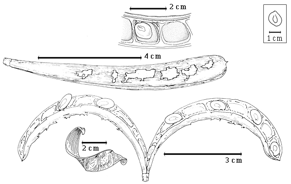 ; unilocular; 7–16 cm long; 1–2.2 cm wide; 0.6–1.3 cm thick; 2–9 times longer than wide; with deciduous androecial sheath; with deciduous corolla; with deciduous calyx; without orifice formed by curving of fruit or fruit segments; straight to curved; not plicate; not twisted; symmetrical; oblong; not inflated; compressed; without beak; rounded at apex; aligned with longitudinal axis of fruit; long tapered at base; aligned with longitudinal axis of fruit; with the apex and base uniform in texture; ligneous; seed chambers externally invisible; margin not constricted; margin without sulcus; margin plain; wing(s) absent; substipitate; with all layers dehiscing; splitting along suture(s). Dehiscence of valves along both sutures; apical and down; active; with valves revolute and breaking (1 valve breaking free at base, remaining attached to sutures). Replum invisible. Epicarp glossy to dull; monochrome; black; with surface texture uniform; pubescent but soon deciduous; with hairs erect; with simple hairs; eglandular; without spines; not smooth; with elevated features; not veined; not tuberculate; faintly obliquely longitudinally striate; checking and exfoliating; without cracks; without embedded tissue, much thicker than epicarp, running from base to apex. Mesocarp present; surface not veined; 1-layered; without balsamic vesicles; with fibers; without reniform canals; fibrous throughout; ligneous. Endocarp present; visible; dull; opaque; monochrome; brown to tan (tinged with brown); smooth; without adhering pieces of testa; septate to nonseptate (with tan line between seeds); not exfoliating; remaining fused to mesocarp and epicarp; entire. Seed(s) 8–9; length oblique to fruit length; neither overlapping nor touching; in 1 series. Funiculus 3 mm long; of 1 length only; thick; curved. Aril absent.