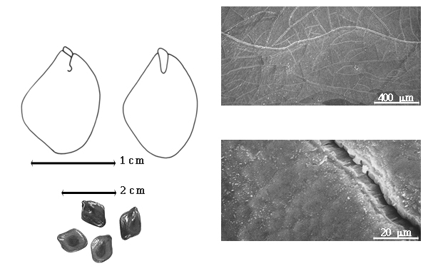 Seed: 7–18 mm long; 5–11 mm wide; 3 mm thick; not overgrown; angular; symmetrical; elliptic to rhombic, or circular to quadrangular (sub); compressed; with surface smooth; without visible radicle and cotyledon lobes; without hilar sinus; without umbo on seed faces; without medial ridge on each face. Cuticle not exfoliating; not inflated; not wrinkled. Testa present; without pieces of adhering epicarp; not adhering to endocarp; free from endocarp; glossy; not modified by a bloom; colored; monochrome; brown; glabrous; smooth; coriaceous. Pleurogram present (irregular), or absent (based on immature seeds of P. claessenii (de Wildemann) Gilbert & Boutique); 75 %. Pseudopleurogram absent. Fracture lines present (especially along each side of pleurogram). Rim absent. Wing(s) absent. Raphe not visible. Hilum present; fully concealed; concealed by funicular remnant; without faboid split; punctiform; subapical to radicle tip; flush; not within corona, halo, or rim. Lens discernible; 0.5–0.7 mm long; with margins straight; triangular; not in groove of raphe; mounded; similar color as testa; lighter than testa; tan (fringed with black); not within corona, halo, or rim. Endosperm absent. Cotyledons smooth; both outer faces flat; both the same thickness; both more or less of equal length; not folded; margin entire 180 degrees from base of radicle; similar at apex; partially concealing radicle; with lobes; with lobes overlapping; with basal groin formed by lobes; with the interface division terminating at base of radicle; without margins recessed; inner face flat; glabrous on inner face. Embryonic axis slightly deflexed; parallel to length of seed; without a joint evident between the radicle and the cotyledons. Radicle differentiated from cotyledon; straight with embryonic axis; centered between cotyledons. Plumule rudimentary; glabrous.