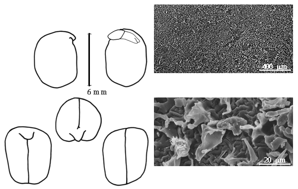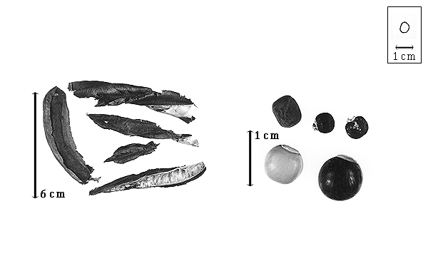 Seed: 3–12.5 mm long; 3–12.2 mm wide; 2.5–11 mm thick; not overgrown; angular, or not angular; symmetrical; circular, or elliptic, or irregular, or oblong, or ovate; terete to quadrangular to compressed; with surface smooth; without visible radicle and cotyledon lobes; without hilar sinus; without umbo on seed faces; without medial ridge on each face. Cuticle not exfoliating; not inflated; not wrinkled. Testa present; without pieces of adhering epicarp; not adhering to endocarp; free from endocarp; glossy to dull; not modified by a bloom; colored; monochrome, or mottled (from literature); black, or brown, or cream, or white, or yellow; with brown overlay; glabrous, or minutely pubescent; smooth, or not smooth (rarely); with elevated features; with 1 longitudinal ridge on each face; coriaceous to chartaceous. Pleurogram absent. Pseudopleurogram absent. Fracture lines absent. Rim absent. Wing(s) absent. Raphe visible, or not visible; from hilum through lens and base of seed to point opposite hilum; not bifurcating; color of testa, or lighter than testa, or darker than testa; brown; recessed. Hilum present; partially concealed; concealed by aril; with faboid split; with the lips of the faboid split the same color as the rest of the hilum, or lighter colored than the rest of the hilum and therefore conspicuous; larger than punctiform; 2.2–5.5 mm long; with curved outline; elliptic; apical according to radicle tip but marginal according to seed length; flush; within rim, or not within corona, halo, or rim; rim color of testa. Lens discernible; 0.8–1.8 mm long; with margins straight, or curved; linear; circular, or elliptic; not in groove of raphe, or in groove of raphe; confluent with hilum; mounded, or flush; same color as testa, or similar color as testa; darker than testa; black, or brown (dark); not within corona, halo, or rim. Endosperm absent. Cotyledons smooth; both outer faces convex; both the same thickness; both more or less of equal length; not folded; margin entire 180 degrees from base of radicle; similar at apex; partially concealing radicle; notched at radicle; without lobes; with the interface division terminating at base of radicle; without margins recessed, or with margin(s) recessed; with 1 margin recessed; recessed on same side as radicle; yellow; inner face flat; glabrous on inner face. Embryonic axis right angled, or oblique; perpendicular to length of seed to oblique to length of seed; without a joint evident between the radicle and the cotyledons. Radicle differentiated from cotyledon; bulbose, or triangular; lobe tip straight; straight with embryonic axis, or oblique to cotyledons; centered between cotyledons; less than 1/2 length of cotyledons. Plumule moderately developed to well developed; glabrous.