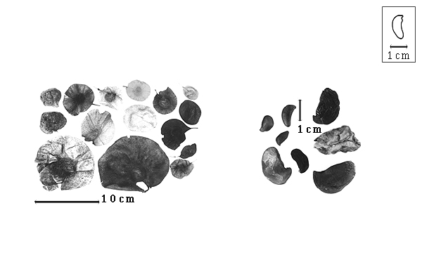 Seed: 7–14 mm long; 2–9 mm wide; 3–3.6 mm thick; not overgrown; not angular, or angular; asymmetrical; reniform, or D-shaped, or irregular; compressed; with surface smooth; with visible radicle and cotyledon lobes, or without visible radicle and cotyledon lobes; without external groove between radicle and cotyledon lobes; with shallow hilar sinus; without umbo on seed faces; without medial ridge on each face. Cuticle not exfoliating; not inflated; not wrinkled. Testa present; without pieces of adhering epicarp; not adhering to endocarp; free from endocarp; dull, or glossy; not modified by a bloom; colored; monochrome; brown (light to dark reddish), or tan; glabrous; smooth, or not smooth; with elevated features; wrinkled; chartaceous. Pleurogram absent. Pseudopleurogram absent. Fracture lines absent. Rim absent. Wing(s) absent. Raphe not visible, or visible; from hilum through lens to base of seed and terminating (near base); not bifurcating; darker than testa; brown (reddish); raised (slightly). Hilum present; visible, or partially concealed, or fully concealed; concealed by funicular remnant, or funiculus; with faboid split; with the lips of the faboid split the same color as the rest of the hilum; larger than punctiform, or punctiform; 0.3–1 mm long; with curved outline; circular, or elliptic; between cotyledon and radicle lobe; recessed; within rim; rim color darker than testa. Lens discernible; with margins curved; circular (nearly and with or without attenuate ends); not in groove of raphe; confluent with hilum (or nearly so); mounded; same color as testa; not within corona, halo, or rim. Endosperm present; thin; not pluglike and not resembling tip of radicle; covering entire embryo; adnate to testa. Cotyledons smooth, or not smooth; 1–3 grooves on each face; both outer faces convex; both the same thickness; both more or less of equal length; not folded, or with only 1 folded; not sufficiently folded for inner face to touch itself; portions of inner folded face unequal; margin entire 180 degrees from base of radicle; similar at apex; partially concealing radicle; notched at radicle; without lobes; with the interface division terminating at base of radicle; without margins recessed; brown (reddish); inner face flat; glabrous on inner face. Embryonic axis deflexed; oblique to length of seed; without a joint evident between the radicle and the cotyledons. Radicle differentiated from cotyledon; bulbose; lobe tip straight, or curved; deflexed and parallel to cotyledon width; centered between cotyledons; less than 1/2 length of cotyledons. Plumule moderately developed; glabrous.