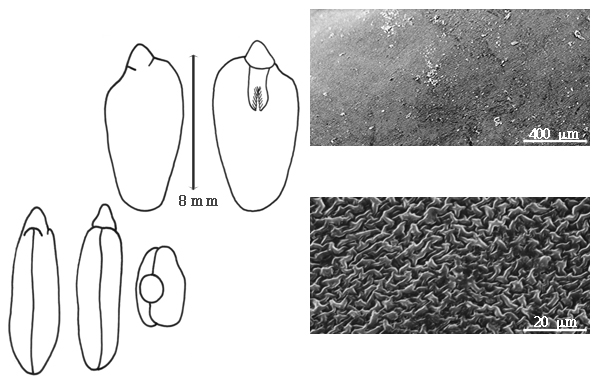 Seed: 8.5–9.5 mm long; 4–5 mm wide; 1.5–3.5 mm thick; overgrown, 1 seed filling entire fruit cavity; not angular; symmetrical (except for hilum); oblong, or ovate; compressed; without visible radicle and cotyledon lobes; without hilar sinus; without umbo on seed faces; without medial ridge on each face. Cuticle not exfoliating; not inflated; not wrinkled. Testa present; without pieces of adhering epicarp; not adhering to endocarp; free from endocarp; dull; not modified by a bloom; colored; monochrome; black, or tan; glabrous; smooth; coriaceous. Pleurogram absent. Pseudopleurogram absent. Fracture lines absent. Rim absent. Raphe visible; from hilum through lens to base of seed and terminating; not bifurcating; darker than testa; black; flush. Hilum present; partially concealed to fully concealed; concealed by aril; with faboid split; with the lips of the faboid split the same color as the rest of the hilum; punctiform; marginal according to radicle tip; recessed; within rim; rim color of testa. Lens discernible; 1 mm long; with margins straight, or curved; oblong; oblong; not in groove of raphe; adjacent to hilum; mounded; dissimilar color from testa; darker than testa; dark brown; within rim; rim color of testa. Endosperm absent. Cotyledons smooth; both outer faces convex; both the same thickness; both more or less of equal length; not folded; margin entire 180 degrees from base of radicle; similar at apex; partially concealing radicle; split over radicle; with lobes; with the interface division terminating at base of radicle; white; inner face flat; glabrous on inner face. Embryonic axis straight; parallel to length of seed; without a joint evident between the radicle and the cotyledons. Radicle differentiated from cotyledon; linear; straight with embryonic axis; centered between cotyledons; less than 1/2 length of cotyledons. Plumule well developed; glabrous.