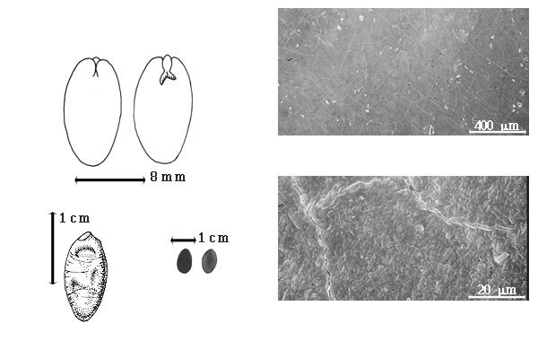 Seed: 8–11 mm long; 5–7 mm wide; 2–3 mm thick; not overgrown; not angular; symmetrical, or asymmetrical; elliptic to ovate; compressed; with surface smooth; without visible radicle and cotyledon lobes; without hilar sinus; without umbo on seed faces; without medial ridge on each face. Cuticle not exfoliating; not inflated; not wrinkled. Testa present; without pieces of adhering epicarp; not adhering to endocarp; free from endocarp; glossy; not modified by a bloom; colored; monochrome; brown, or green; glabrous; not smooth; with elevated features; rugose (faint); coriaceous. Pleurogram absent. Pseudopleurogram absent. Fracture lines present; concentric. Rim absent. Wing(s) absent. Raphe not visible. Hilum present; visible, or fully concealed; concealed by funicular remnant; without faboid split; punctiform; apical at apex of radicle tip; flush; not within corona, halo, or rim. Lens discernible; 0.1–0.5 mm long; with margins curved; elliptic to circular; not in groove of raphe; mounded, or flush; dissimilar color from testa; black to brown; not within corona, halo, or rim. Endosperm present; thin; not pluglike and not resembling tip of radicle; adnate to testa. Cotyledons smooth; both outer faces convex; both the same thickness; both more or less of equal length; not folded; margin entire 180 degrees from base of radicle; similar at apex; partially concealing radicle; with lobes; with lobes touching (auriculate); without basal groin formed by lobes; with the interface division terminating at base of radicle; without margins recessed; inner face flat; glabrous on inner face. Embryonic axis straight; parallel to length of seed; without a joint evident between the radicle and the cotyledons. Radicle differentiated from cotyledon; centered between cotyledons. Plumule well developed; glabrous.