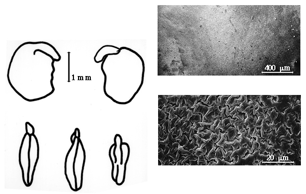 Seed: 2.3–2.5 mm long; 1.7–2 mm wide; 0.5–0.7 mm thick; not overgrown; not angular; symmetrical (except for hilum); elliptic to oblong; compressed; with surface smooth; without visible radicle and cotyledon lobes; without hilar sinus; without umbo on seed faces; without medial ridge on each face. Cuticle not exfoliating; not inflated; not wrinkled. Testa present; without pieces of adhering epicarp; not adhering to endocarp; free from endocarp; dull; not modified by a bloom; colored; monochrome; black (blackish-brown when mature), or green (greenish-brown when immature); glabrous; smooth; coriaceous. Pleurogram absent. Pseudopleurogram absent. Fracture lines absent. Rim absent. Wing(s) absent. Raphe not visible. Hilum present; fully concealed; concealed by aril; without faboid split; punctiform; marginal according to radicle tip; flush; within halo; halo lighter than testa. Lens faintly discernible; with margins curved; circular; not in groove of raphe; adjacent to hilum; 0.1–0.2 mm from hilum; barely mounded; similar color as testa (but in lighter colored halo); within halo; halo color lighter than testa. Endosperm present; thin; not pluglike and not resembling tip of radicle; covering entire embryo; adnate to testa. Cotyledons smooth; both outer faces convex; both the same thickness; both more or less of equal length; not folded; margin not entire 180 degrees from base of radicle; similar at apex; not concealing radicle; entire over radicle; without lobes; with the interface division terminating at base of radicle; without margins recessed; yellow; inner face flat; glabrous on inner face. Embryonic axis deflexed; oblique to length of seed; without a joint evident between the radicle and the cotyledons. Radicle differentiated from cotyledon; linear; deflexed and parallel to cotyledon length; centered between cotyledons; less than 1/2 length of cotyledons. Plumule rudimentary; glabrous.